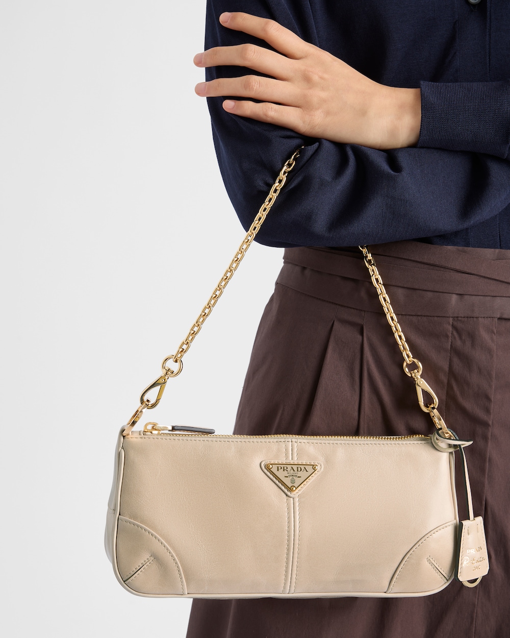 2002年に登場したアイコニックなスタイルを再現した、プラダ Re-Edition ショルダーバッグ。プラダのデザインコードを洗練された汎用性の高いシルエットに凝縮し、過去と現在のスタイルの対話を表現しています。上品な光沢仕上げのレザーを使用した、洗練されたミニマルなアイテム。取り外しのできるエレガントなチェーンハンドルを備え、デイスタイルからイブニングシーンまで大活躍します。仕上げにレザーのキーリングとエナメルメタルのトライアングルロゴをあしらい、メタルパーツで輝きをプラスしました。