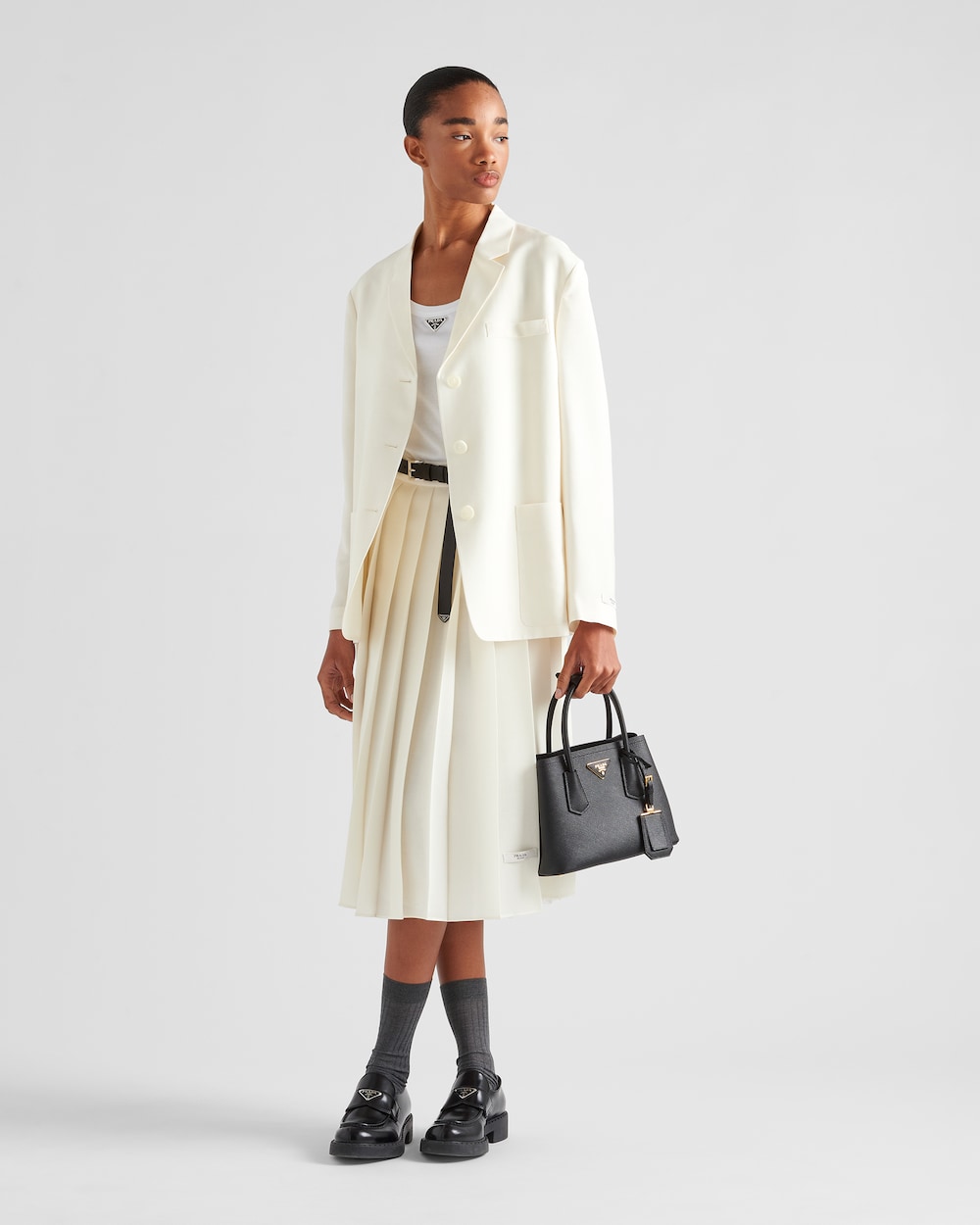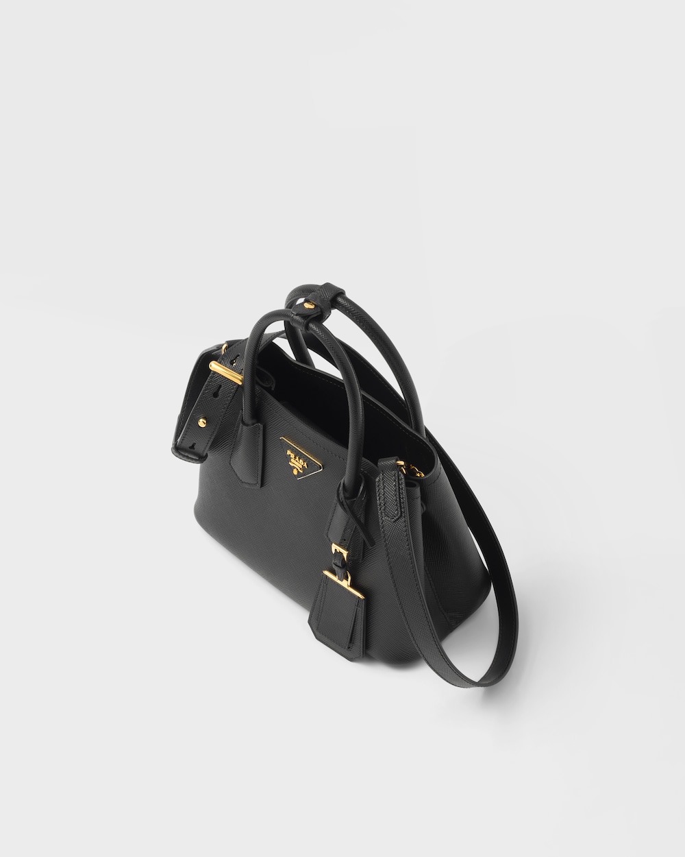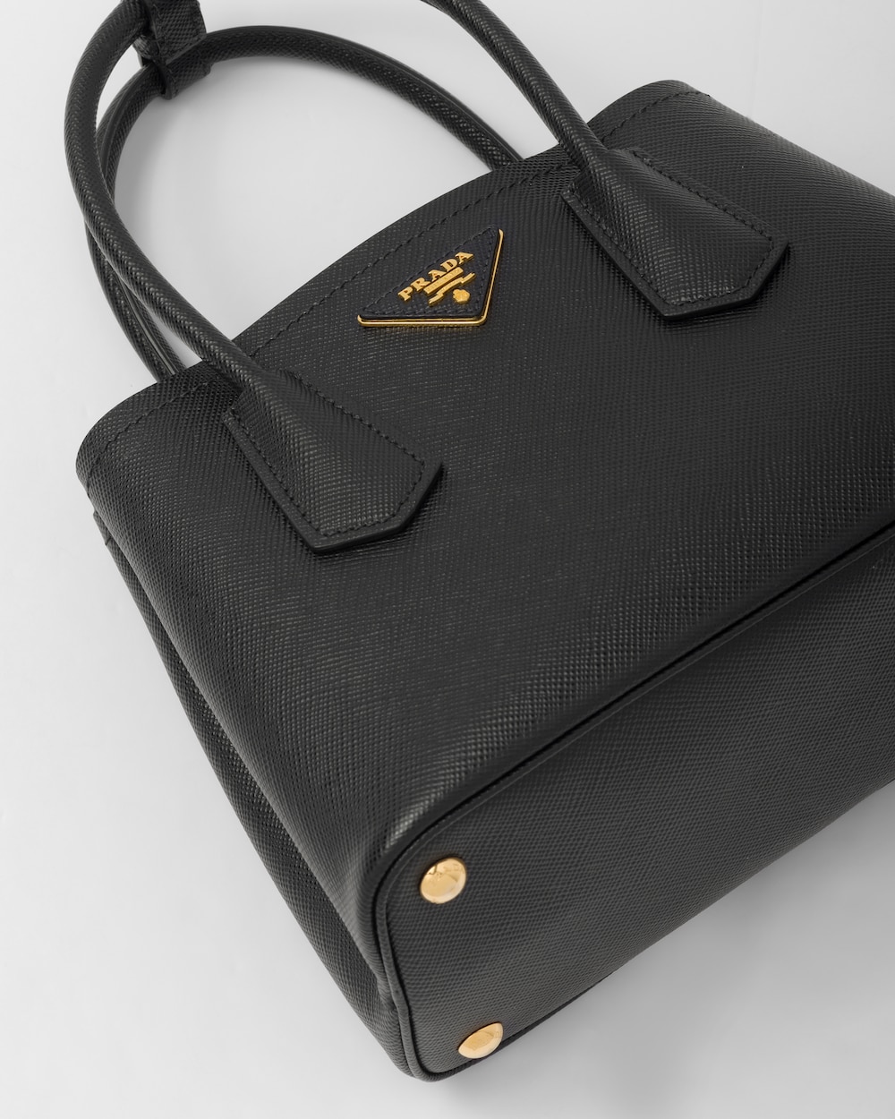使い勝手に優れたミニデザインの洗練されたプラダ ドゥーブレバッグ。ブランドを象徴するデザインに繊細で上品なディテールを施すことで新たな命を吹き込みました。フロントには同色のレザーのトライアングルで縁取ったアイコニックなメタルのレタリングロゴがあしらわれています。取り外し可能なショルダーストラップ付で、ショルダーバッグとしてもクロスボディバッグとしても使用できるアイテム。