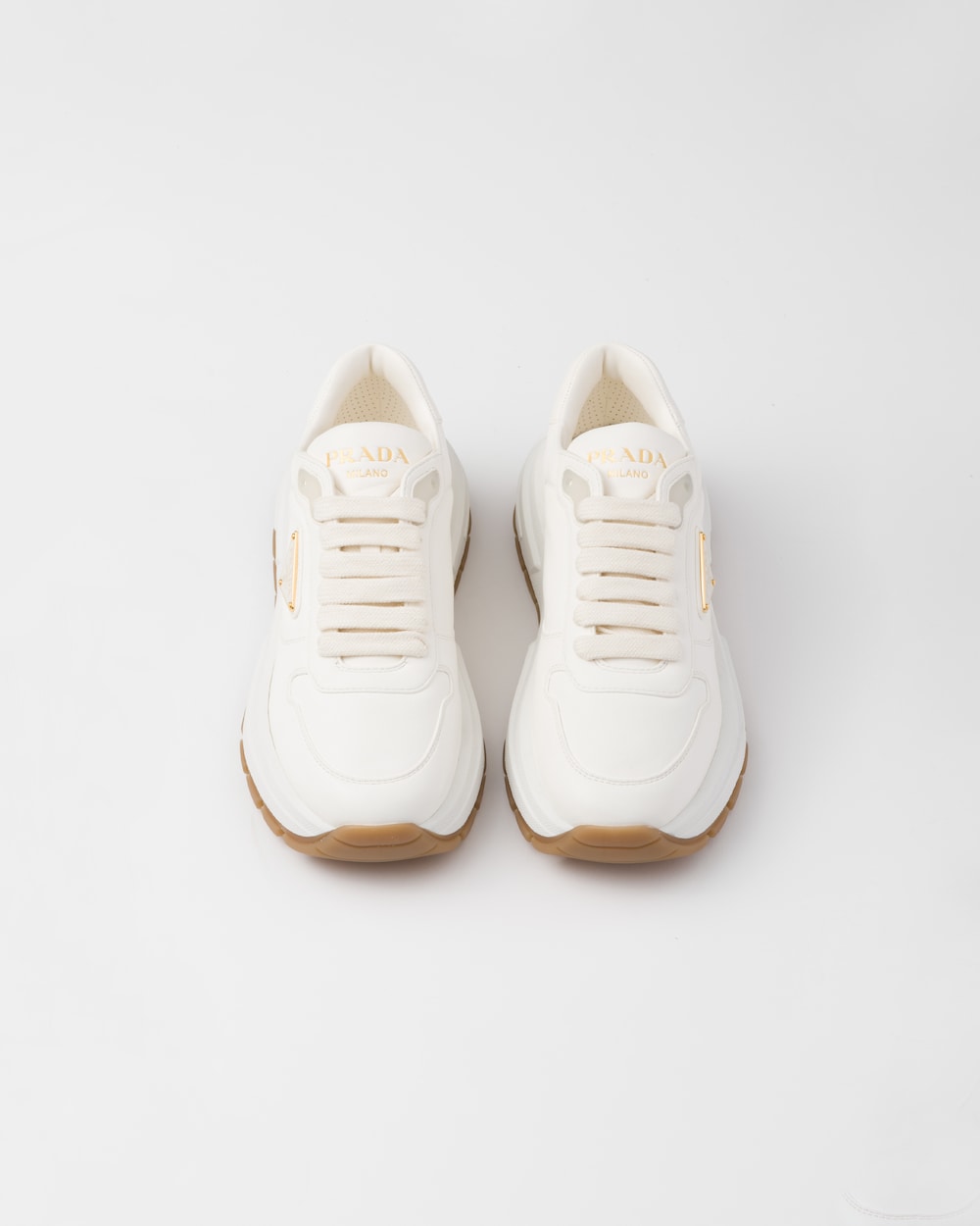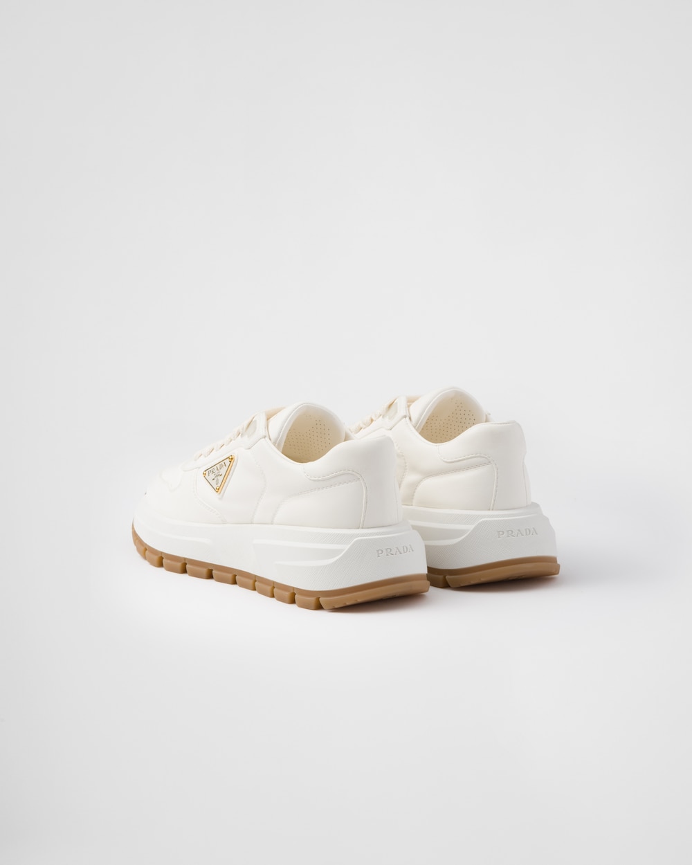 Sporty silhouette and practical, modern design make these leather sneakers appealing. They feature a comfortable rubber sole. Adorned with a diverse interpretation of the Prada logo, they are finished with an iconic enamel metal triangle logo that exudes a unique charm.
