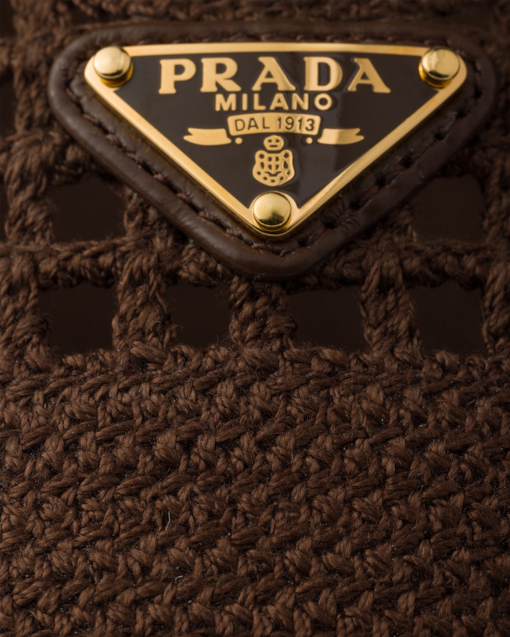女性らしいタイムレスなバレリーナフラットが、繊細で軽やかなニットクロシェデザインで再解釈されています。ラウンドトゥとストラップを備えたテーパードシルエットに、アイコニックなエナメルメタルのトライアングルロゴがあしらわれています。