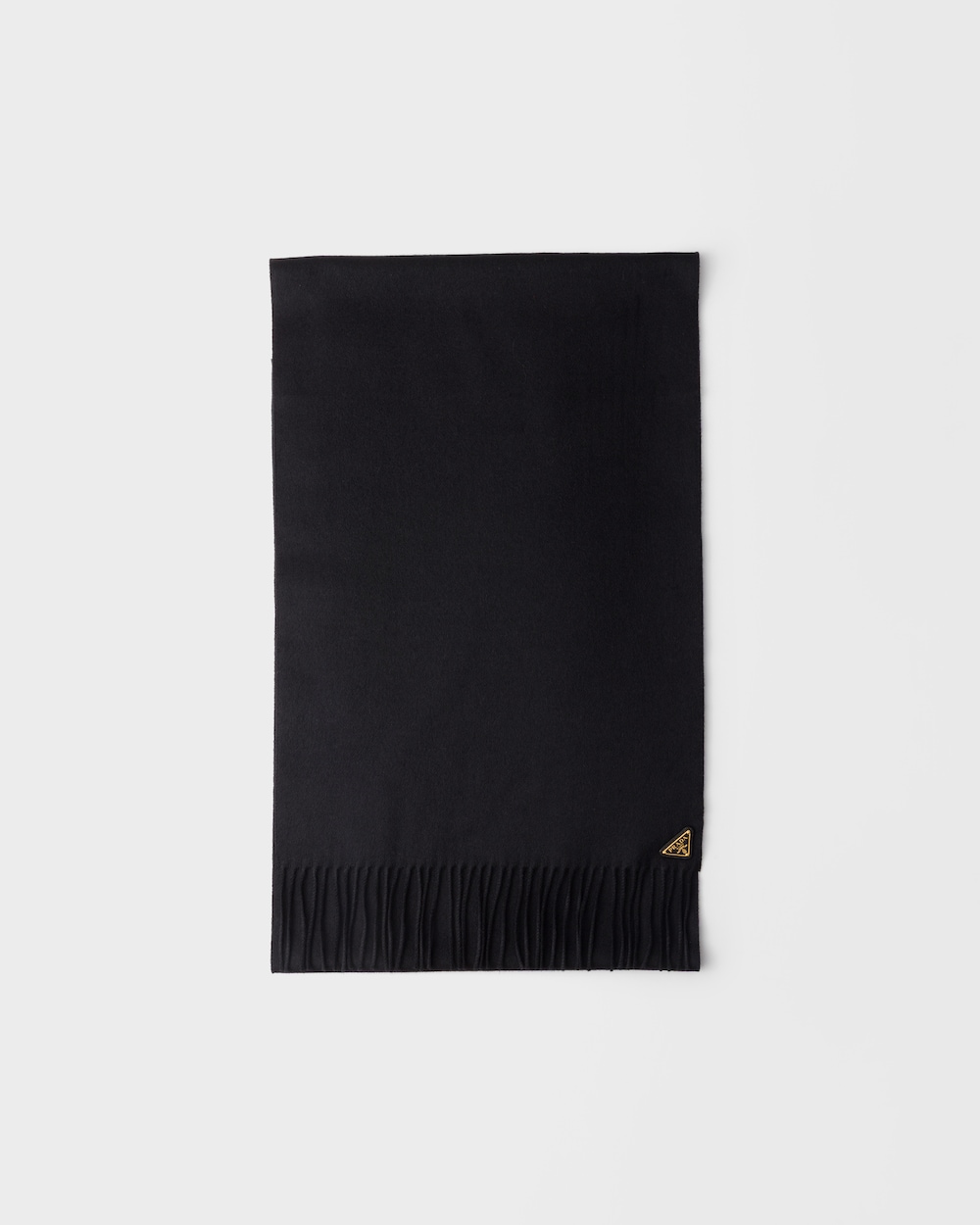 A scarf made from a luxurious blend of silk and cashmere that enhances a sophisticated design. It features classic fringes at both ends. A soft and refined accessory adorned with an iconic enamel metal triangle logo.