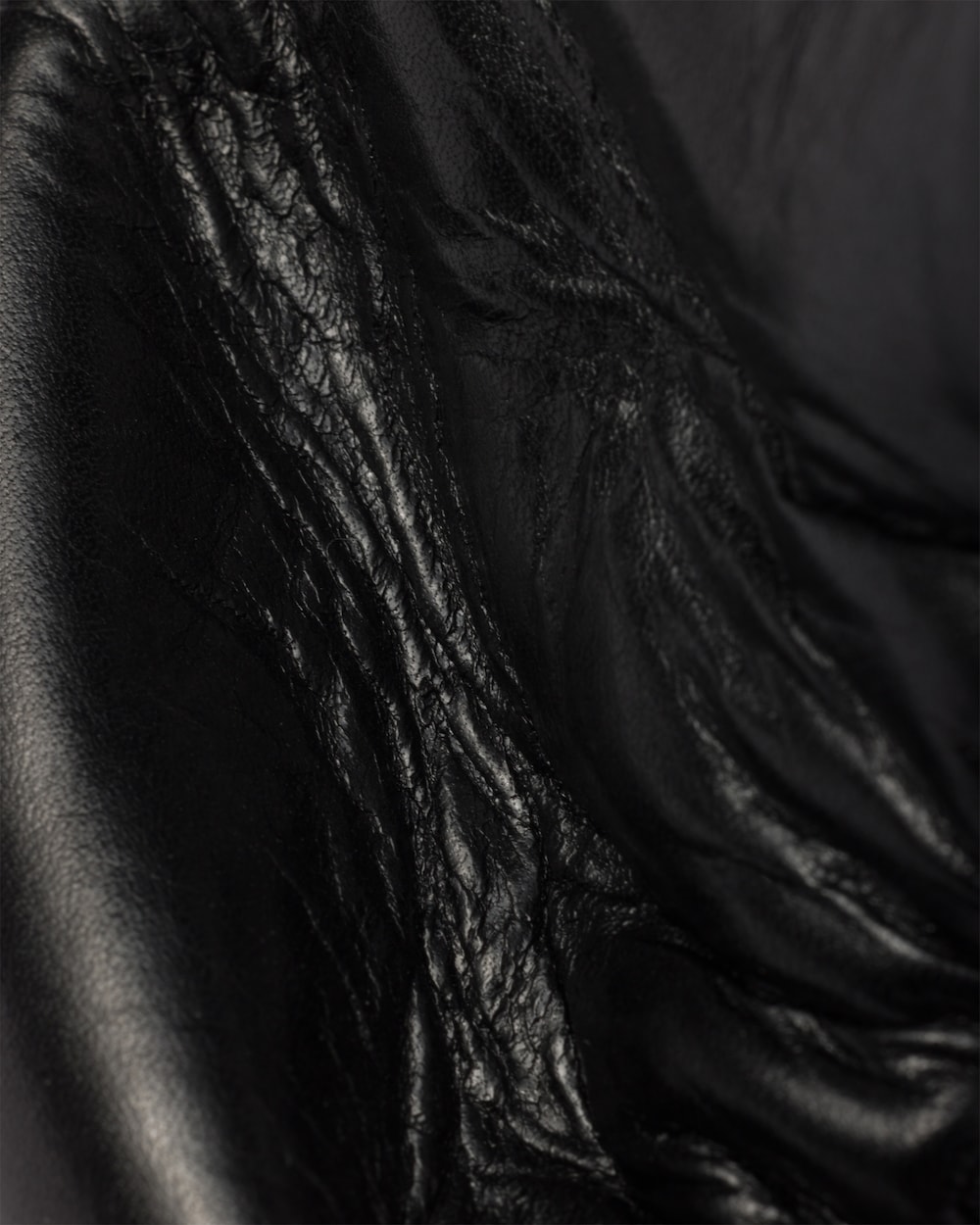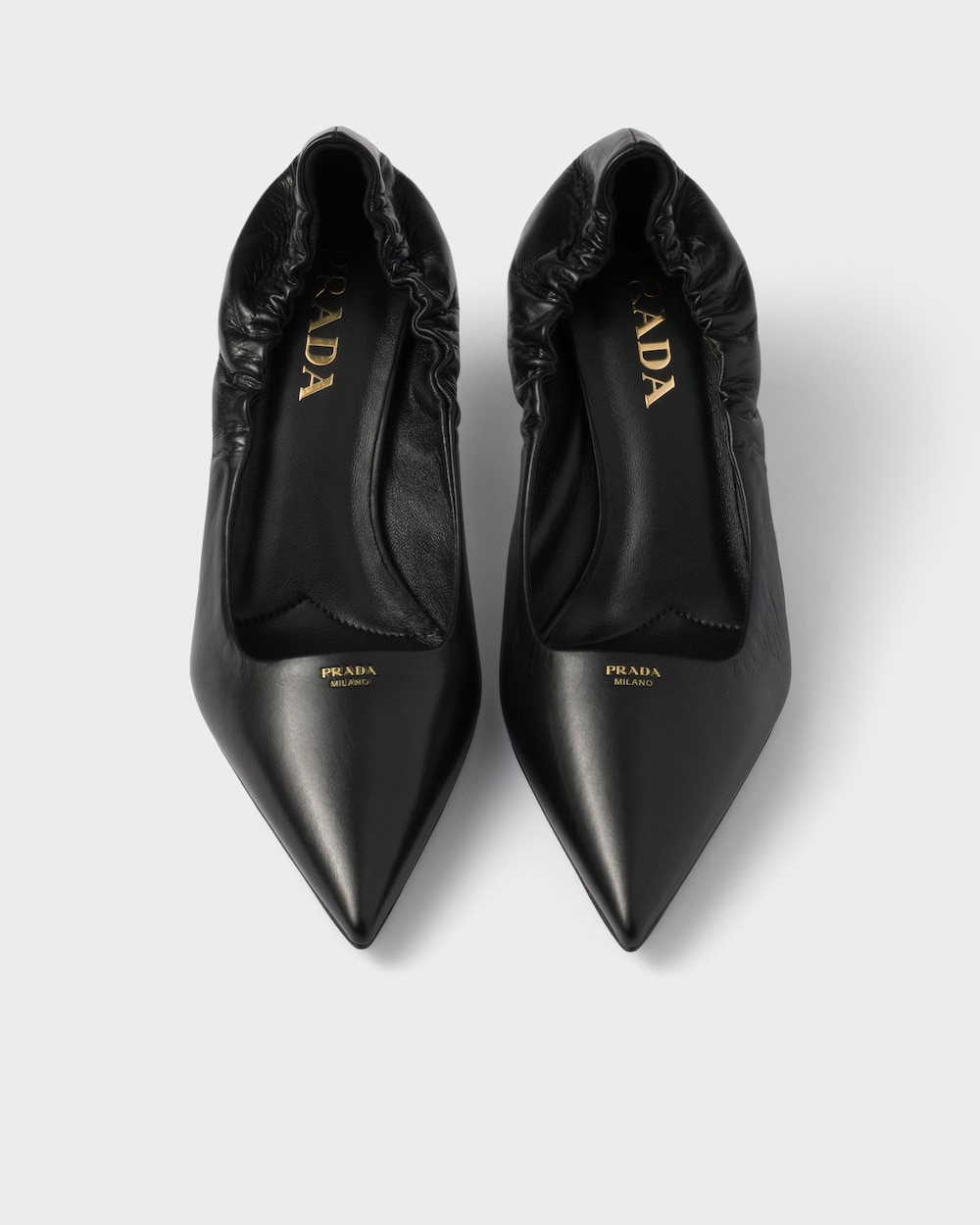 These leather pumps feature a soft, tapered silhouette. The pointed toe design incorporates elastic materials in the heel. Additionally, they are characterized by an architectural heel inspired by the geometric form of Prada's iconic triangle, representing a restructured design.