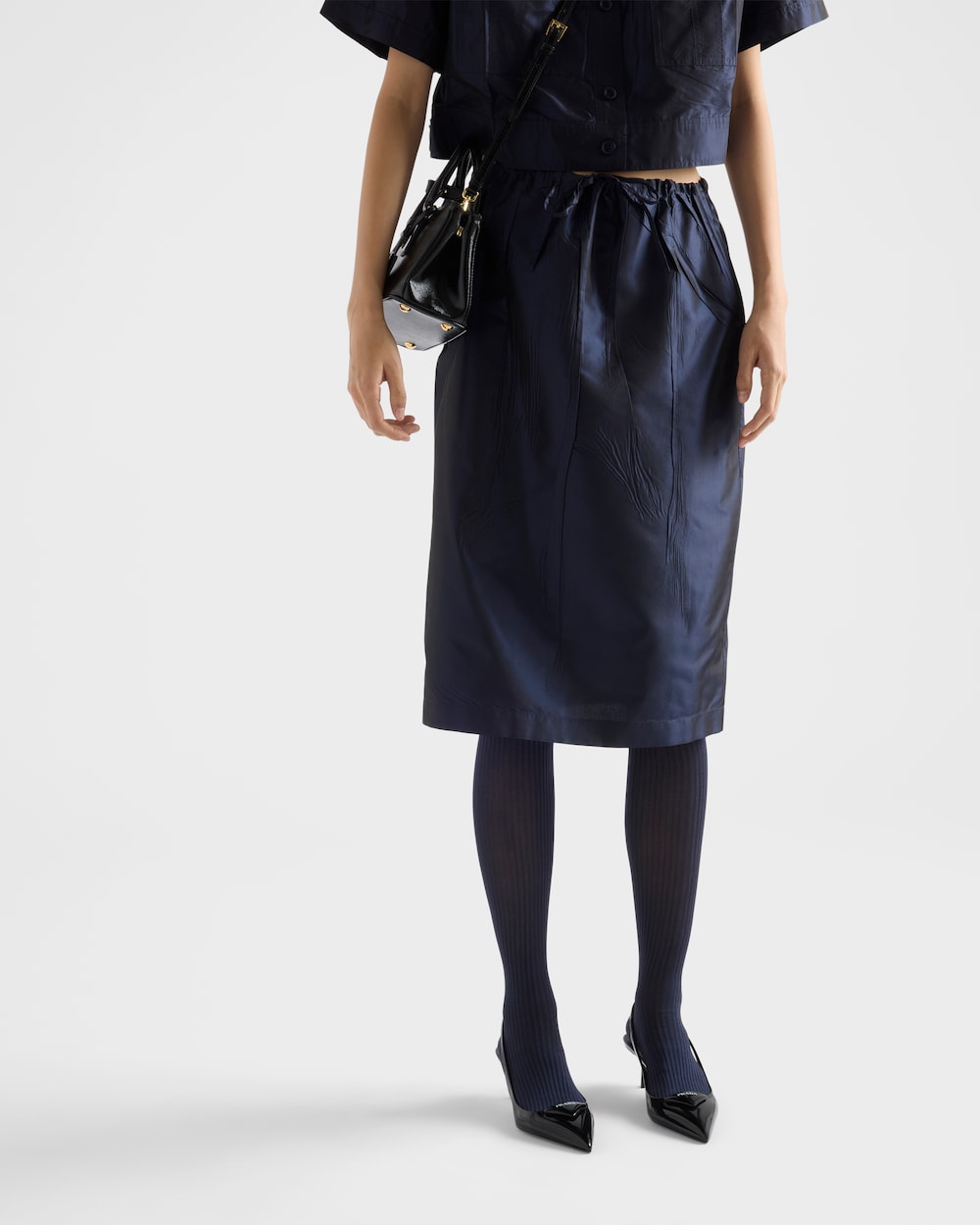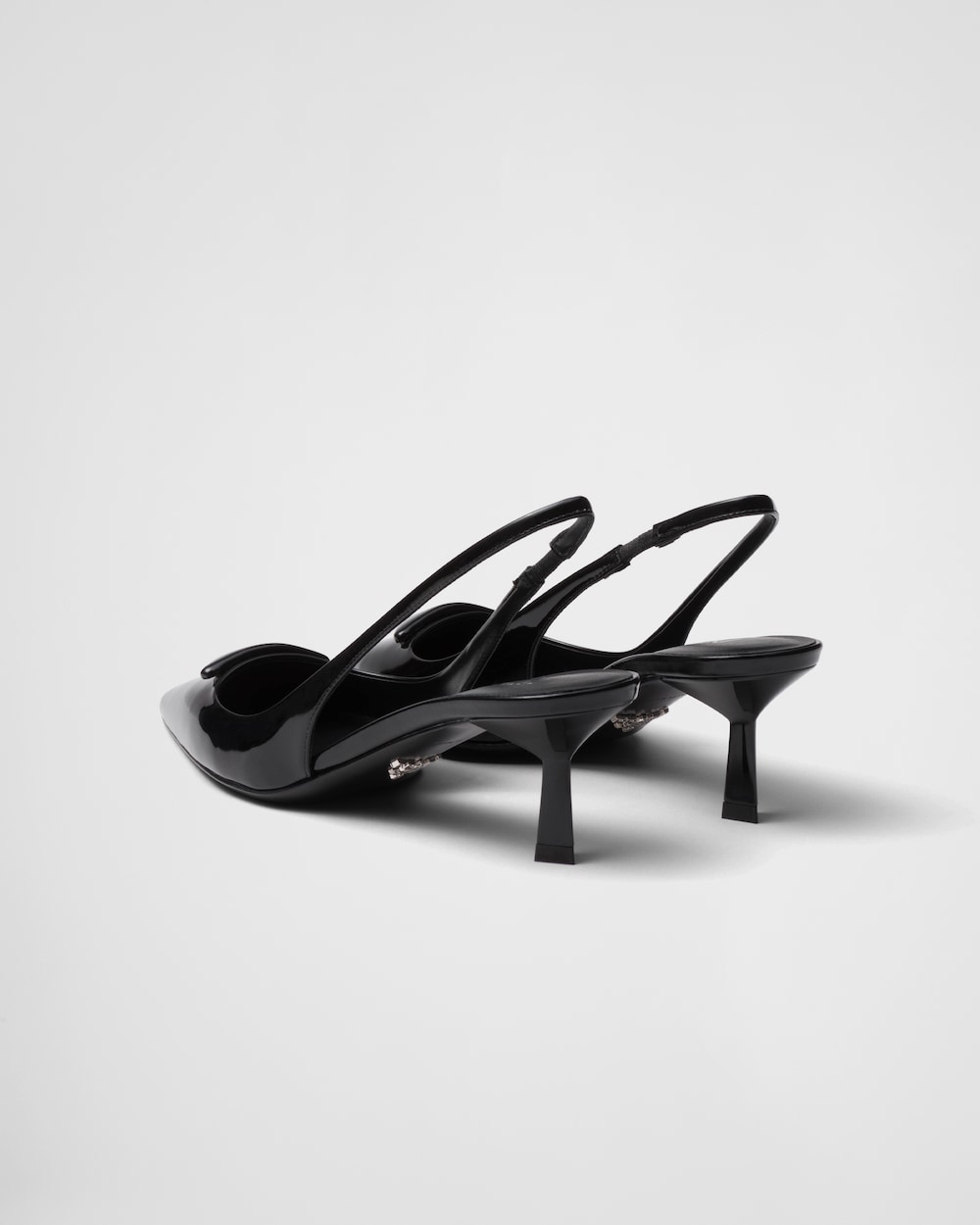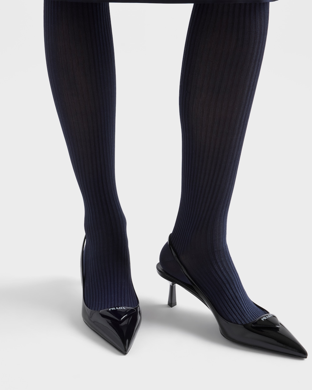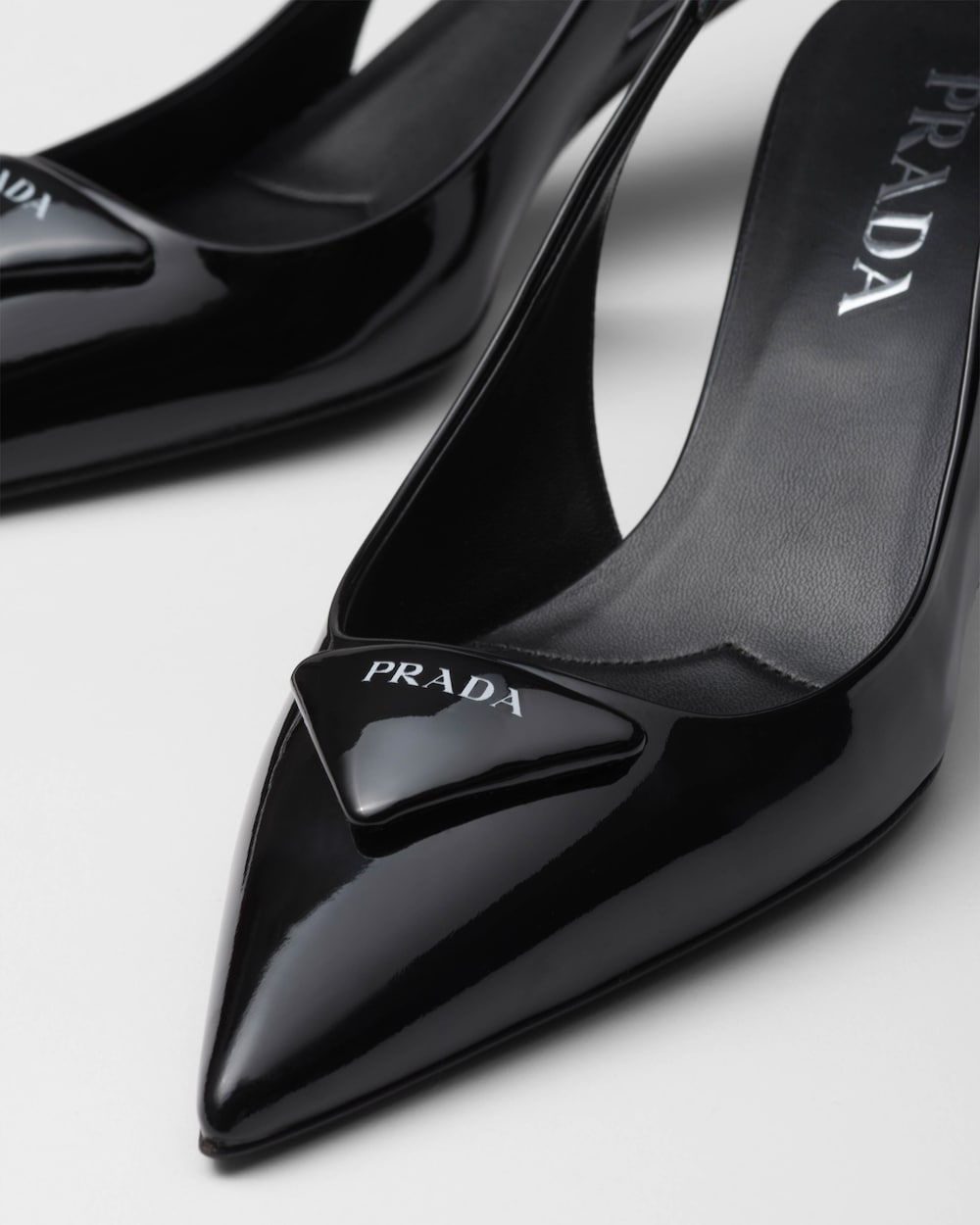 女性らしい洗練されたエレガンスが現代的な魅力を放つパテントレザー(牛革)のパンプス。控えめなパデッドレザーのディテールと、シルエットにモダンなアクセントを演出する幾何学的なラインのヒールは、いずれもトライアングルロゴをモチーフにしています。