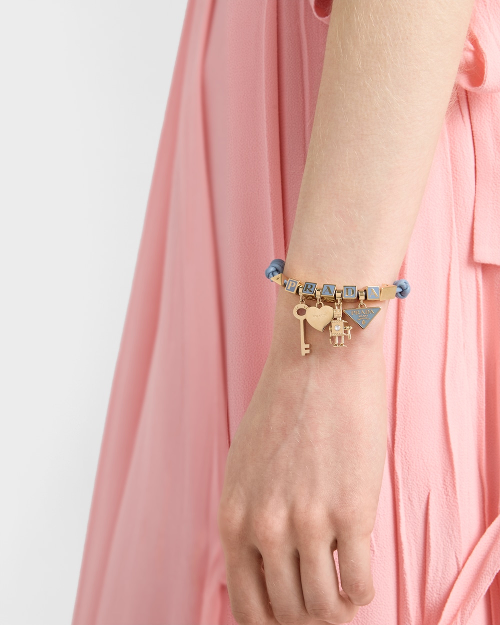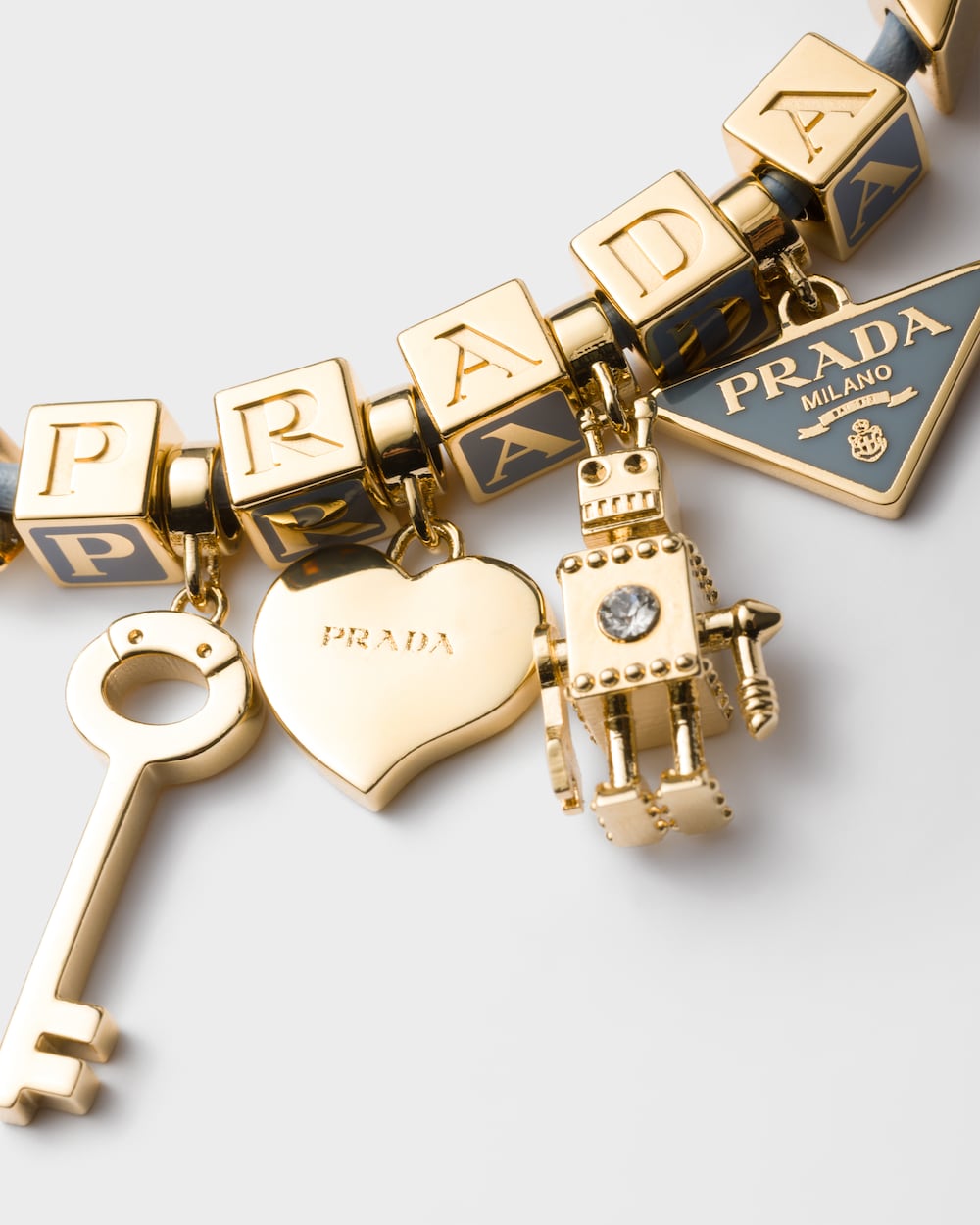 This bracelet made of nappa leather features a combination of geometric shapes and iconic symbols, resulting in a dynamic and modern design. The accessory is adorned with various charms and an enamel metal lettering logo.