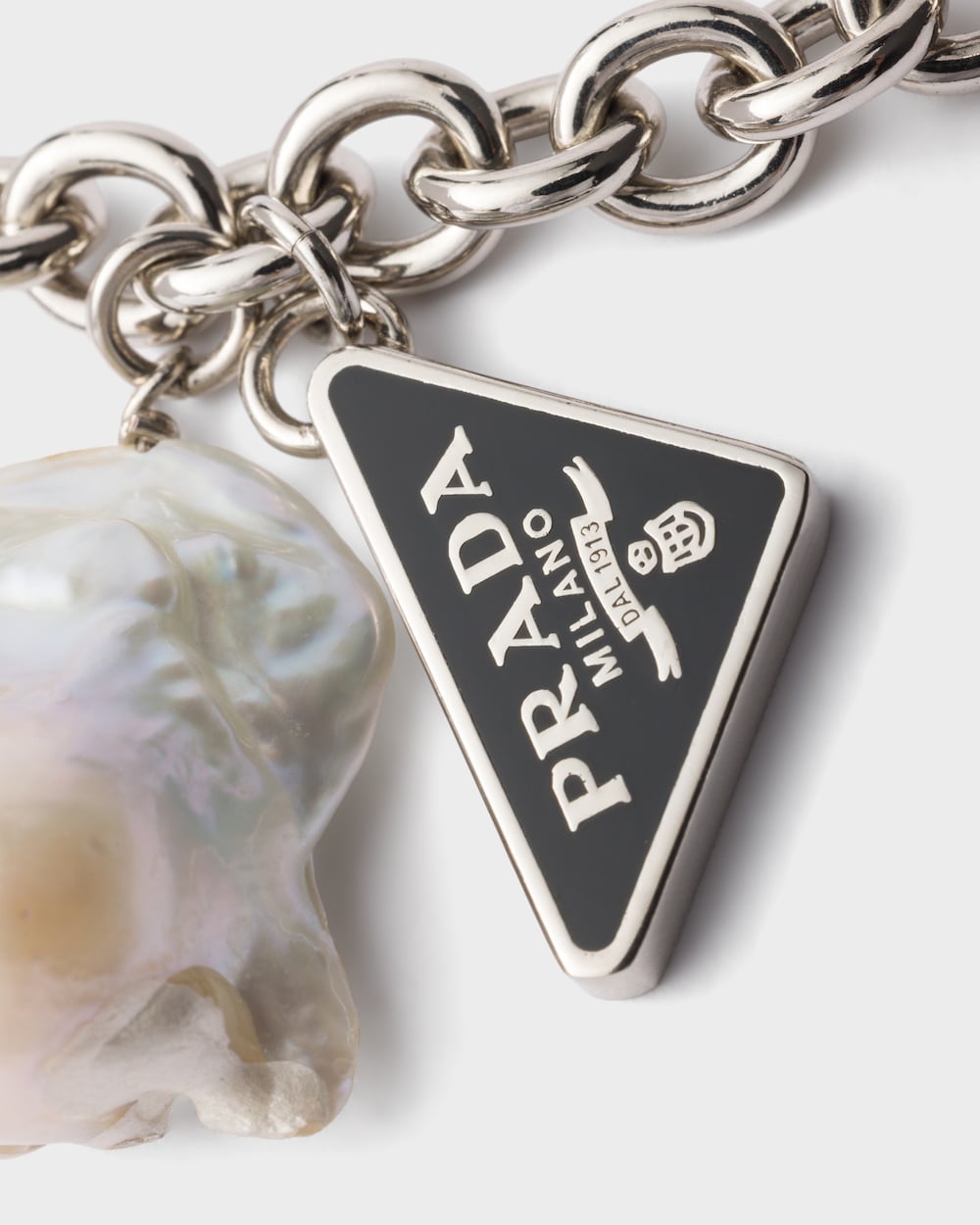 コンテンポラリースタイルのこのメタルネックレスは、予期せぬ組み合わせやコントラストによって形作られています。アクセサリーは、バロックパールの不規則なラインとエナメルメタルのトライアングルロゴで装飾されています。