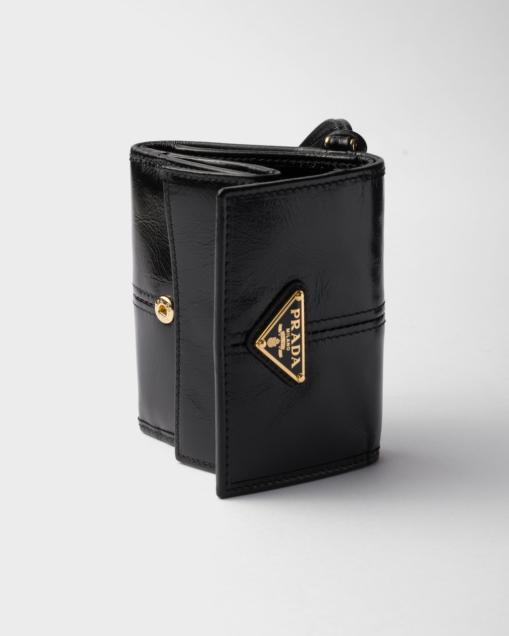 洗練されたモダンな雰囲気が漂う、スモールサイズのレザー財布。エナメルメタルのトライアングルロゴがあしらわれています。上品なディテールと優れたクラフツマンシップにより、タイムレスなアイテムに仕上げました。