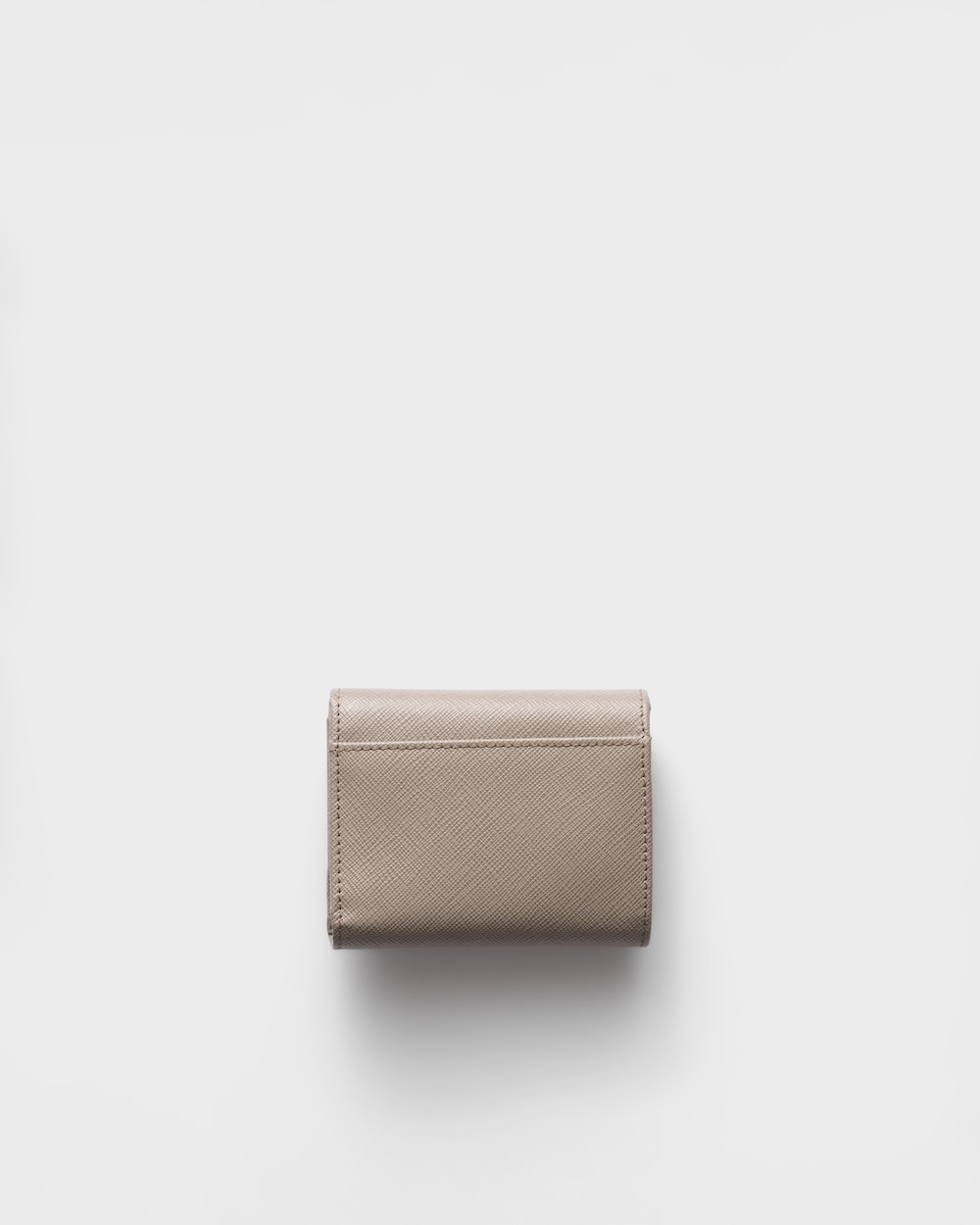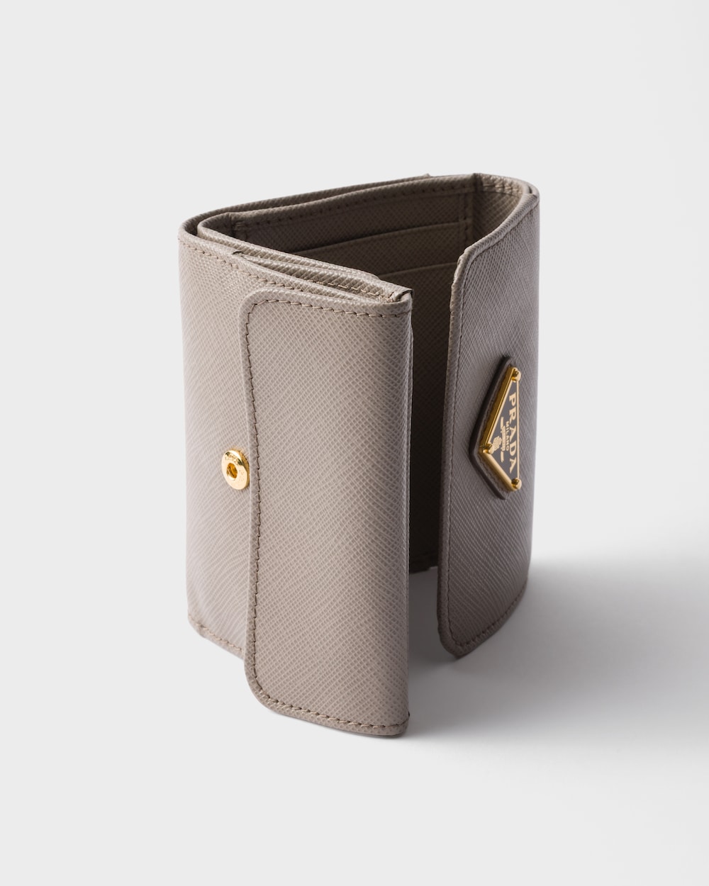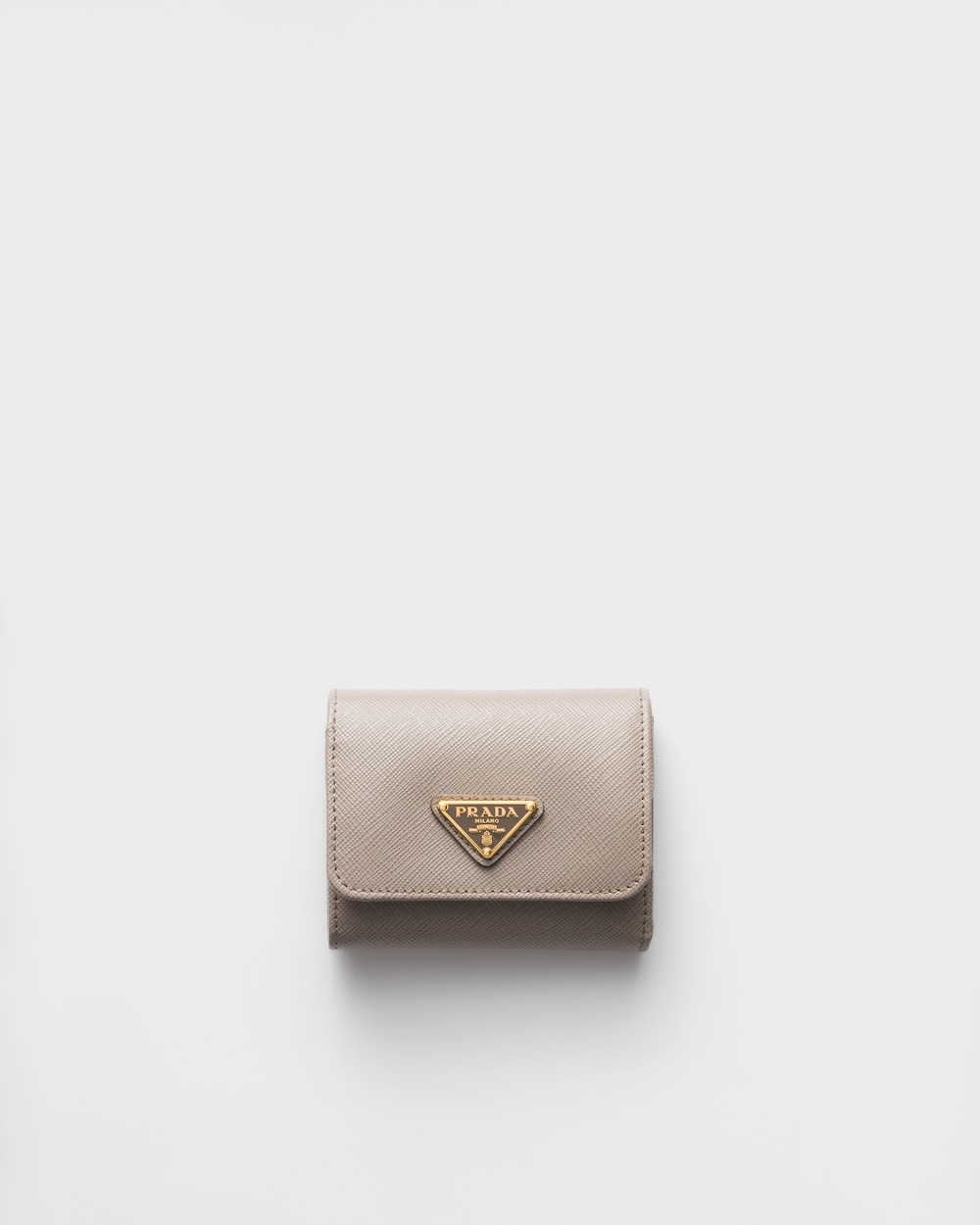 複数の内ポケットとカードホルダーを備えた「サフィアーノ」レザー(牛革)のミニ財布。スナップ開閉式にメタルのレタリングロゴがあしらわれています。