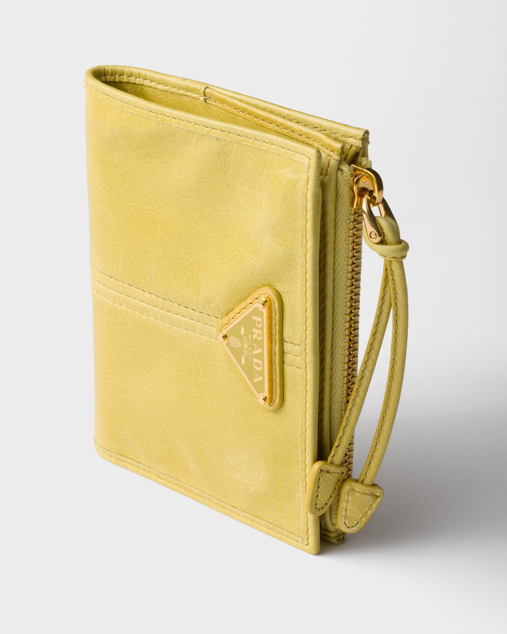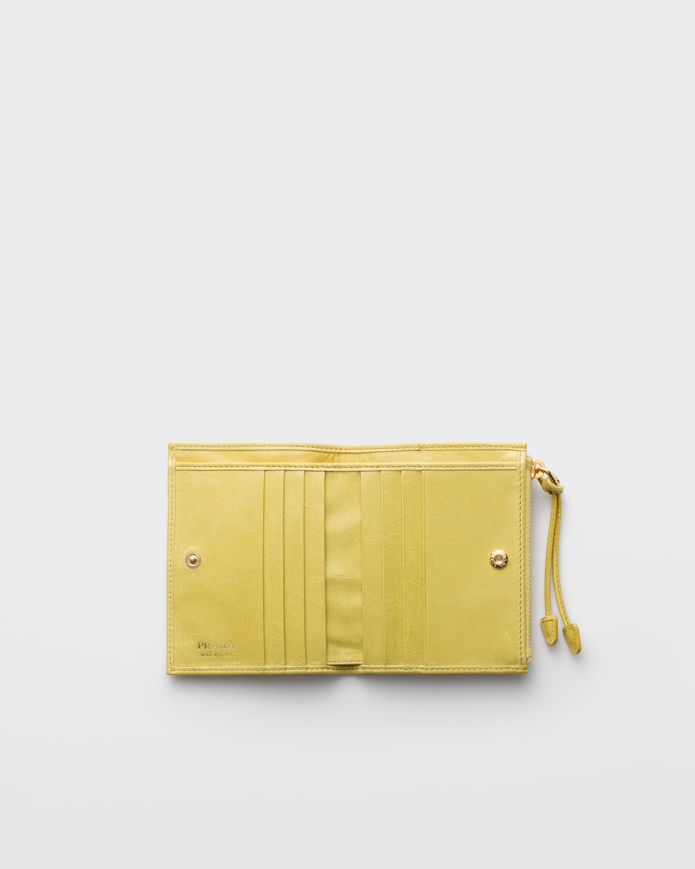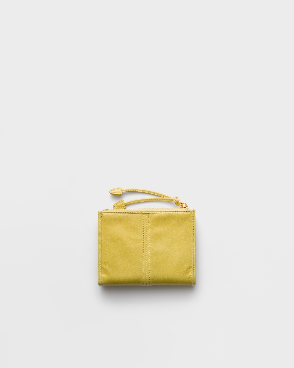 エレガントなレザーにエナメルメタルのトライアングルロゴでアイコニックなアクセントを添えた、上品で華のあるスモールサイズの財布。内側に収納部分を備え、機能的なディテールが施されています。