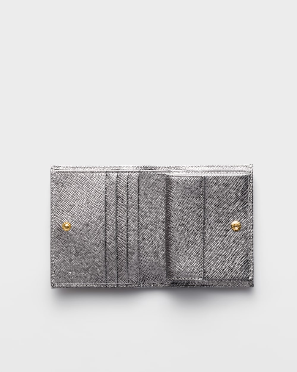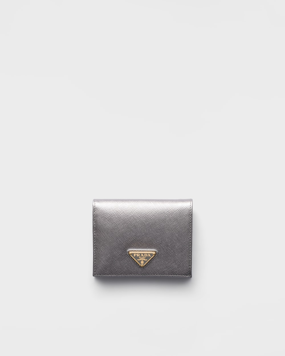 コンパクトなフォルムが美しい、上質な「サフィアーノ」レザー(牛革)の財布。クレジットカードホルダー、札入れと小銭入れが備わったコンパクトな財布。メタルのトライアングルロゴ付。