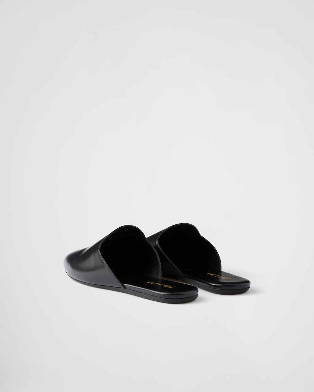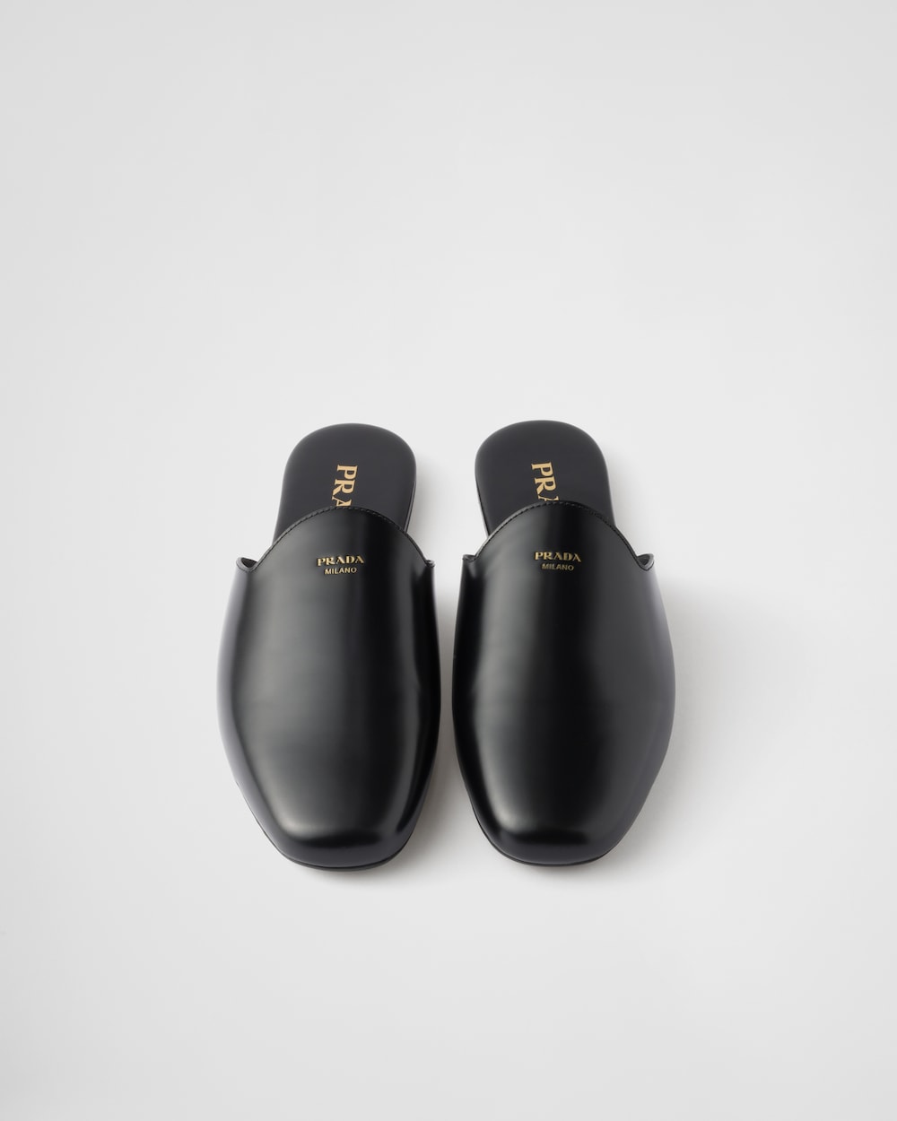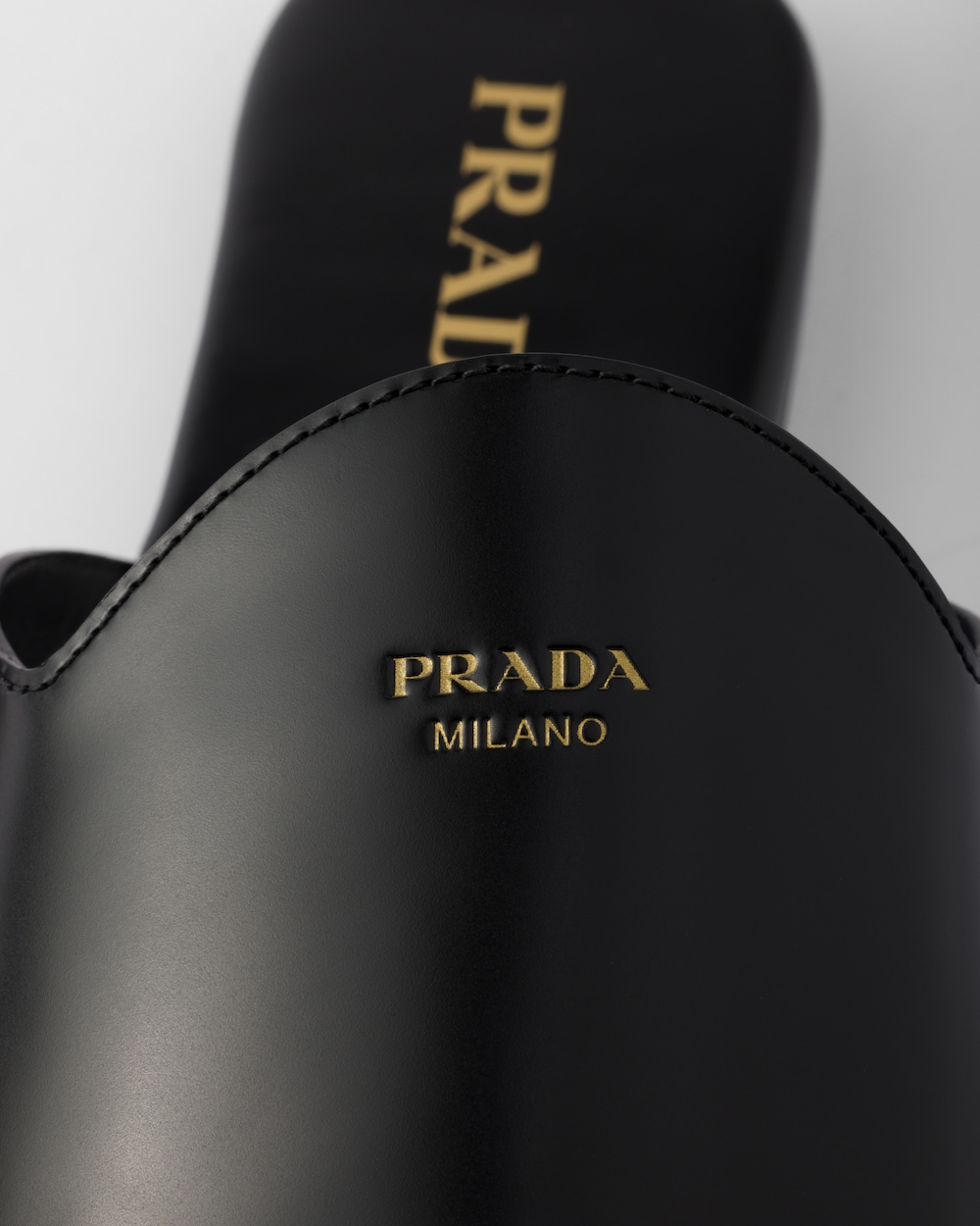 A minimal design mule crafted from brushed leather (cowhide), representing Prada's collection with an elegant style. It features a tapered silhouette characterized by a thin rubber sole reminiscent of men's shoes. The insole enhances comfort.
