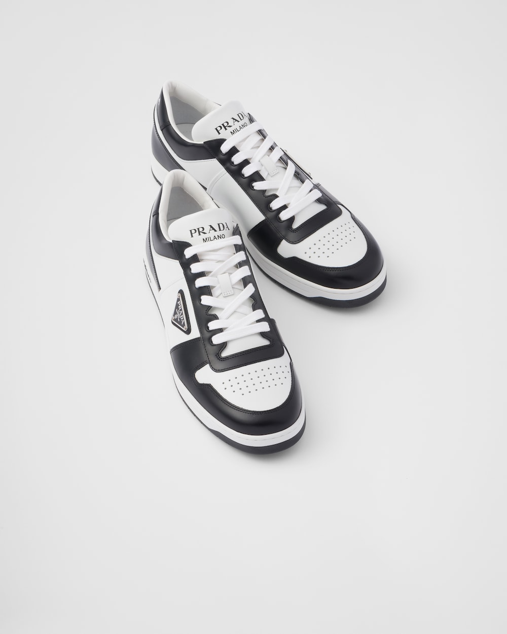 A sporty leather sneaker with a lightweight rubber sole, featuring various interpretations of the logo as accents, such as the iconic enamel metal triangle on the side of the upper and the Prada logo on the tongue.
