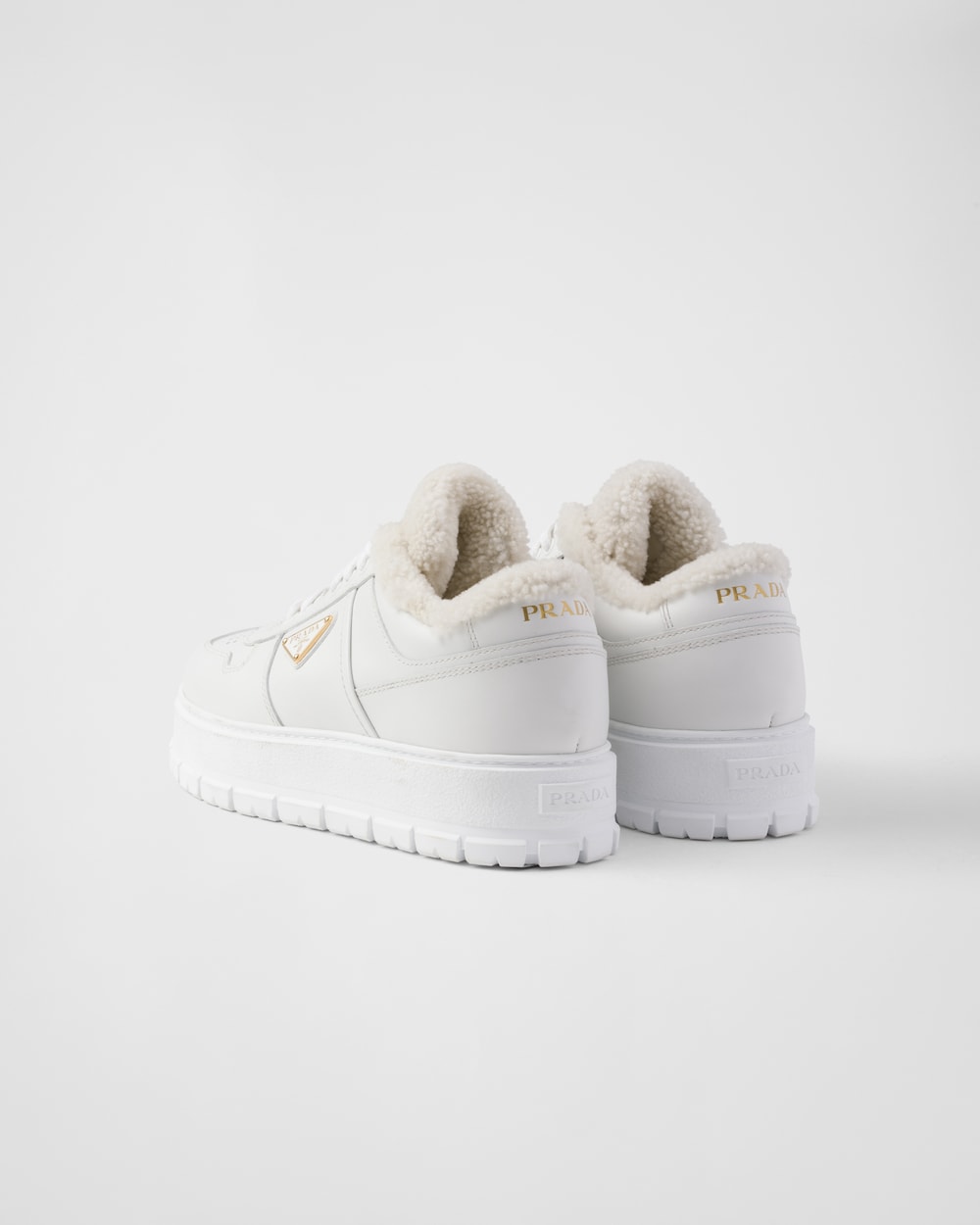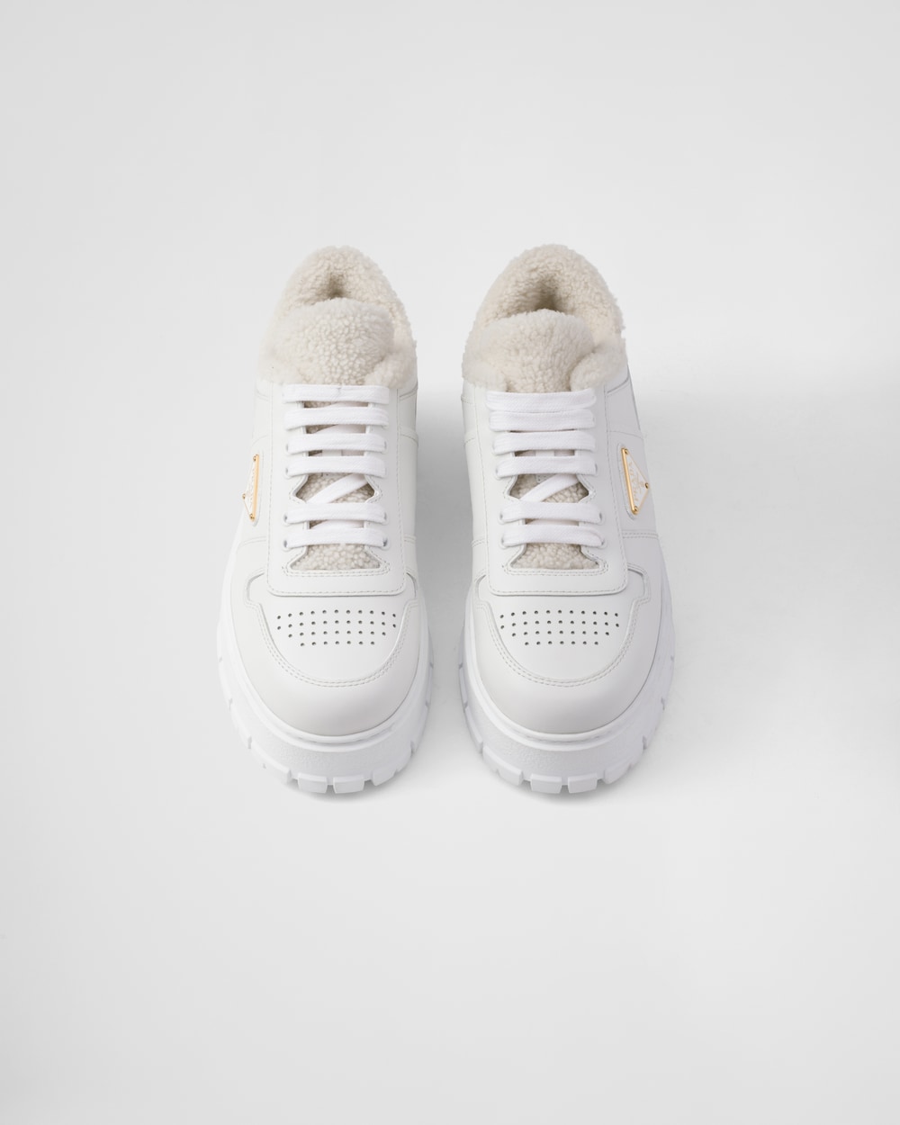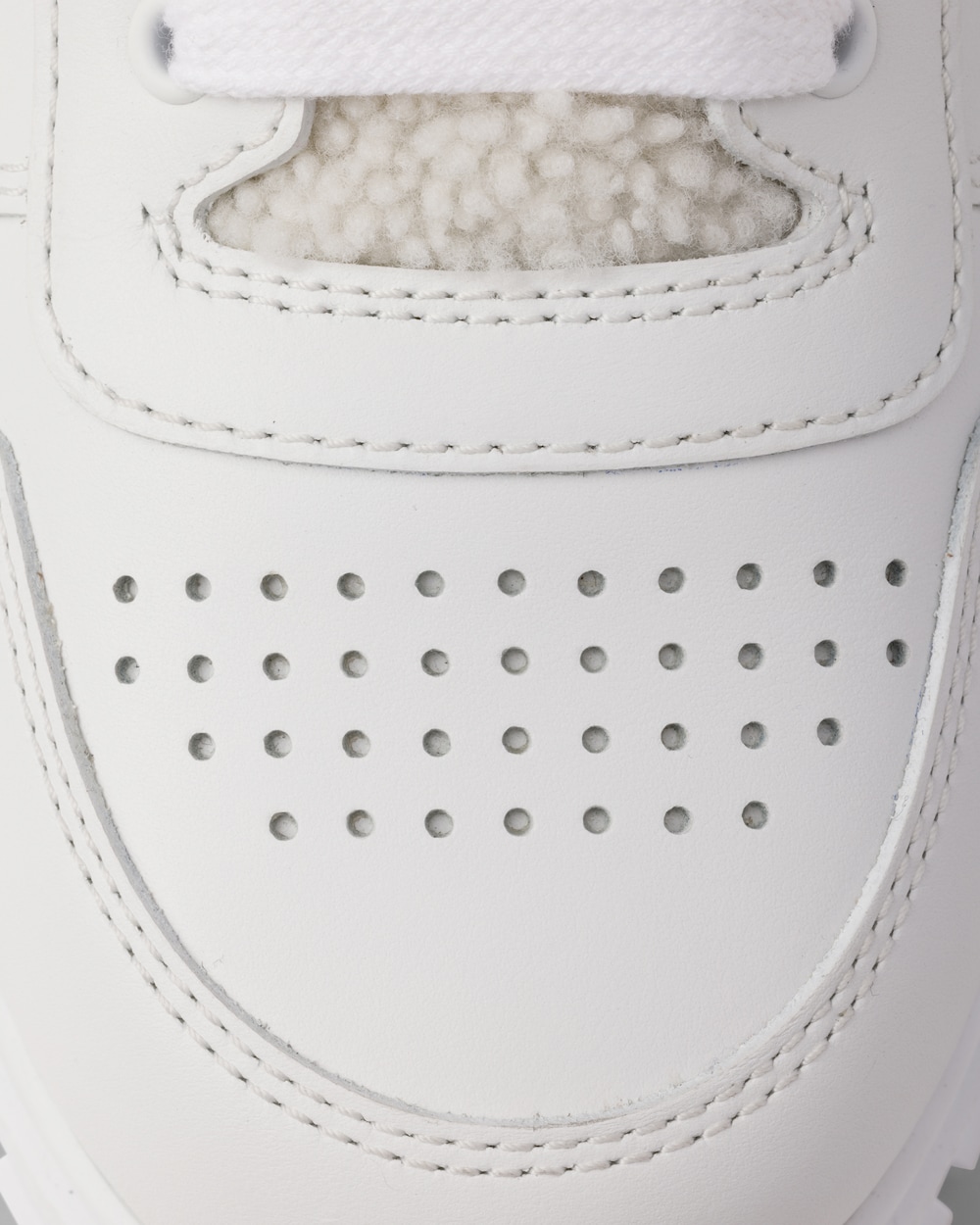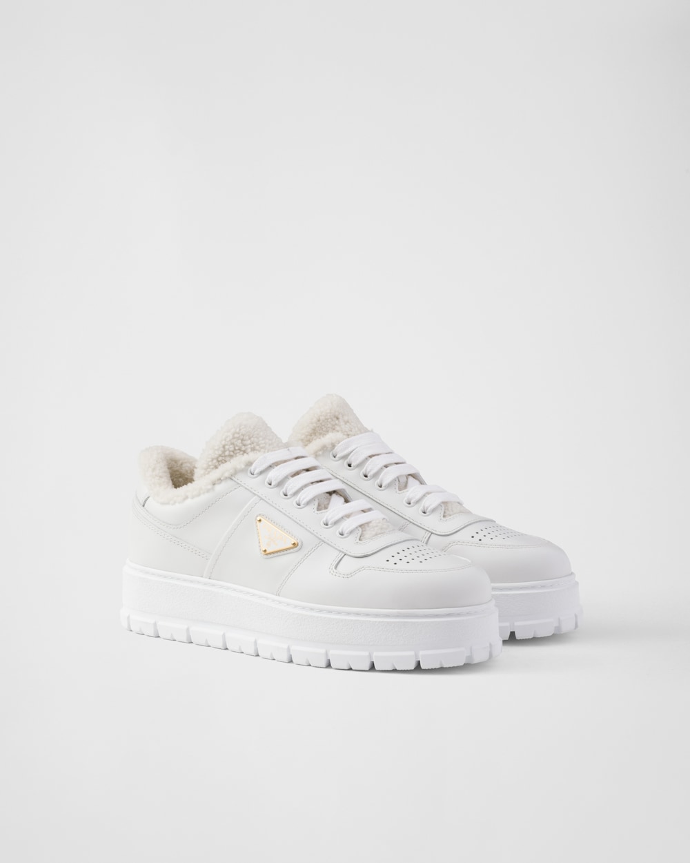 A versatile hybrid design sneaker featuring a chunky sole combined with leather that has been subjected to punching processing. It is lined with soft shearling and adorned with the iconic enamel metal triangle logo.