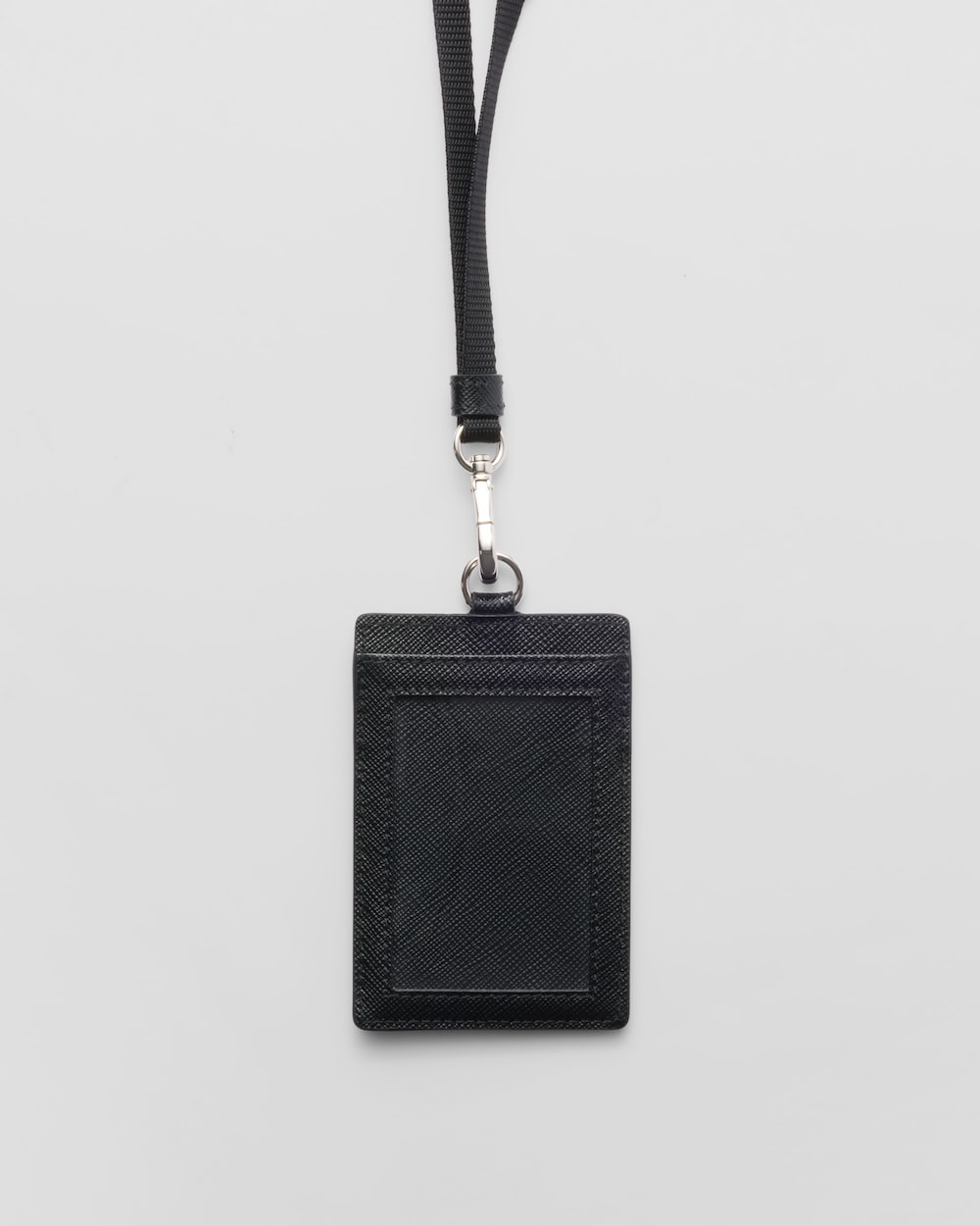 上品で使い勝手に優れたデザインの「サフィアーノ」レザー(牛革)のバッジホルダー。表側にカードホルダー2個、裏側にバッジ用のクリアポケットが付いています。トライアングルロゴにモダンな再解釈を加え、トーナルカラーでエンボス加工したアイテム。