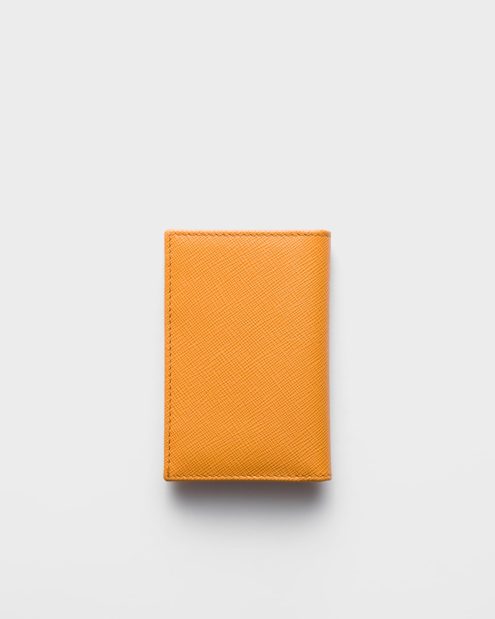 モノトーンの「サフィアーノ」レザー(牛革)を使用したカードケース。コーナー部分にトライアングルロゴをあしらいました。内側にカードホルダー6個、ポケット2個を備え、ヒートエンボス加工のプラダのロゴを施したデザインです。