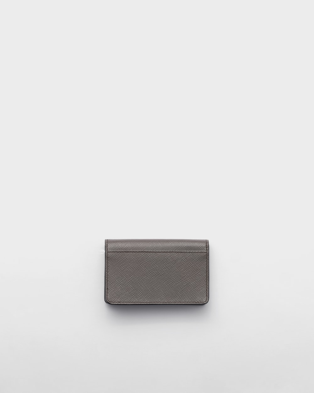 カードホルダー2個を備え、メタルのレタリングロゴをあしらったカードケース。洗練されたデザインが際立つ、使い勝手に優れたアイテム。「サフィアーノ」レザー(牛革)のデザインに、モアレとサフィアーノのライニングを添えました。