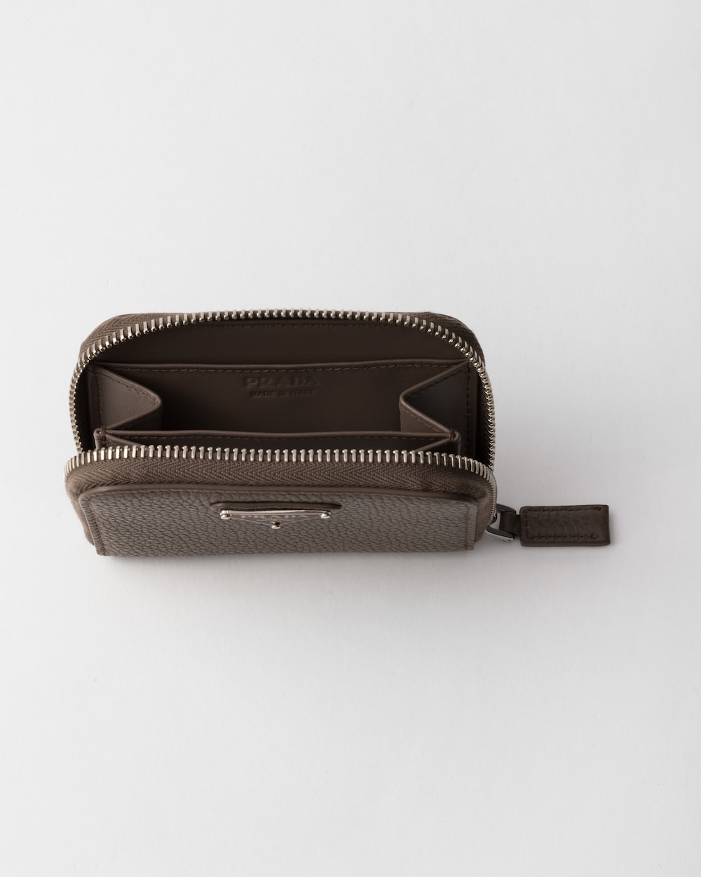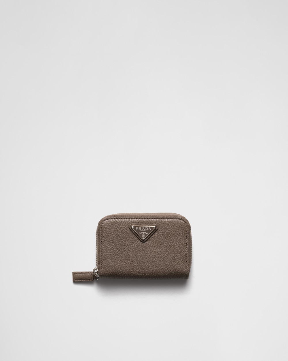 洗練されたラインが魅力的なレザーのコインケース。内側にポケット1個とカードホルダー2個を備え、アイコニックなエナメルメタルのトライアングルロゴをあしらいました。