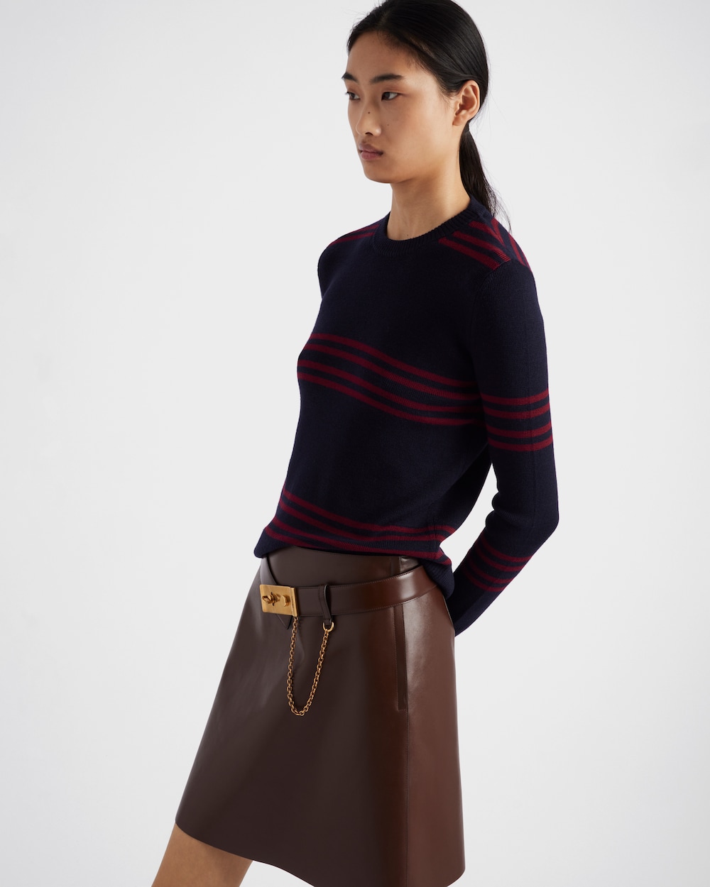 A sophisticated line and elegant design highlighted by a subtle flare characterize this leather mini skirt. The belt with a metal buckle, inspired by the archive, enhances the silhouette and adds an iconic and timeless accent.