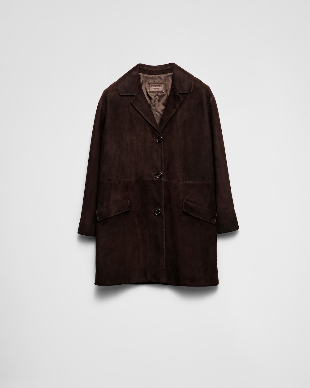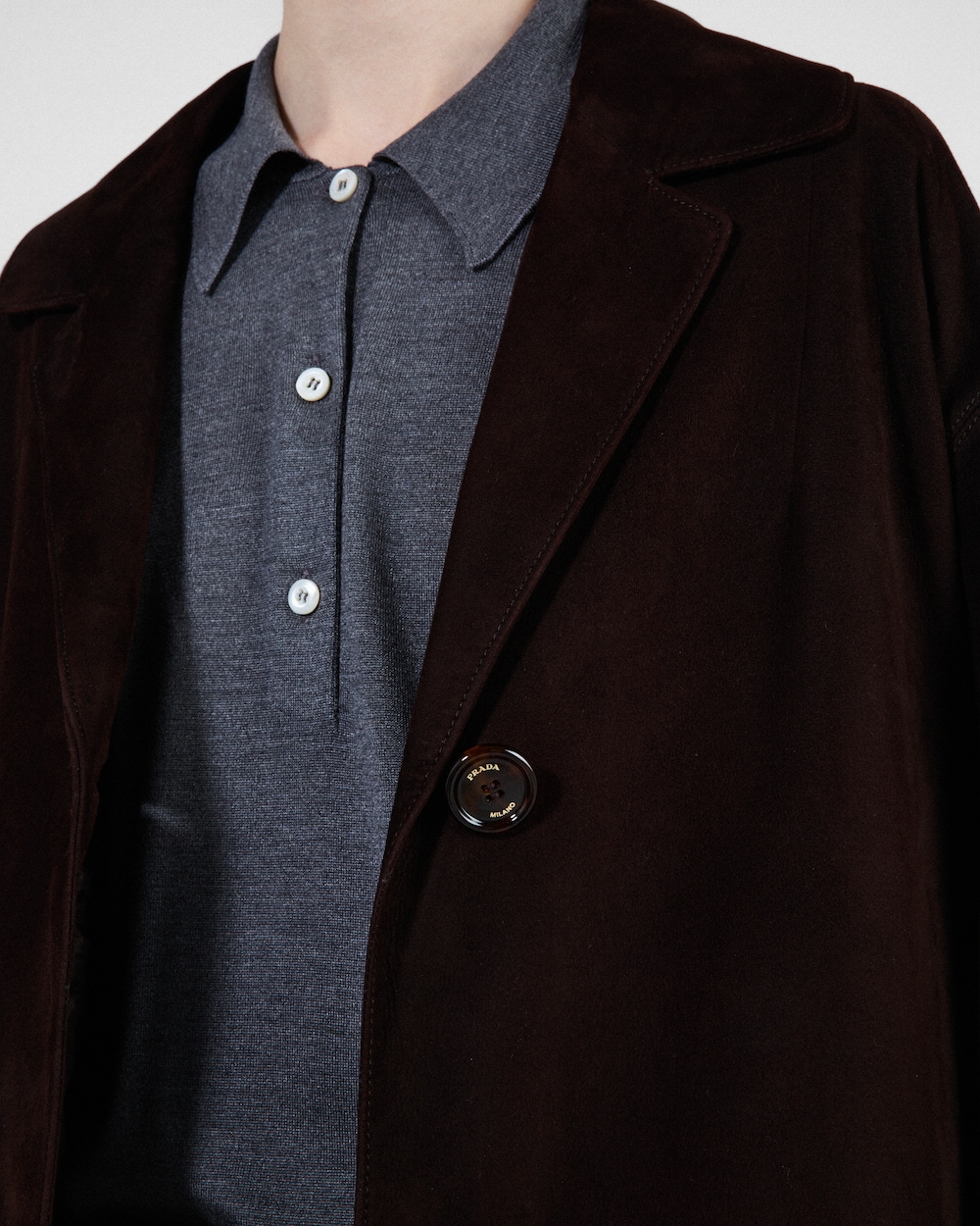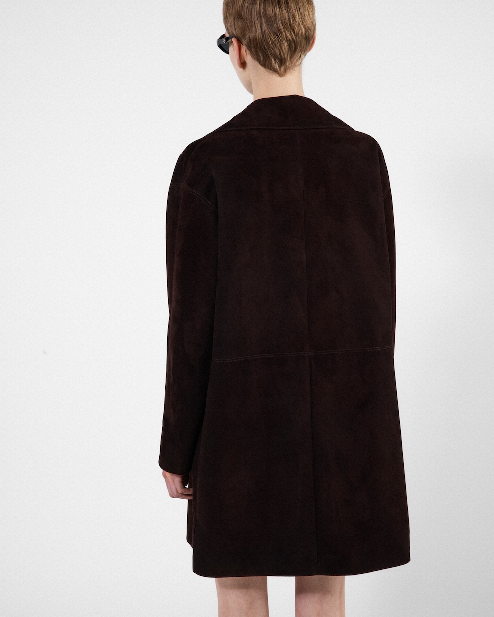 A suede coat characterized by exquisite details. It blends retro style with modern and minimalistic design.