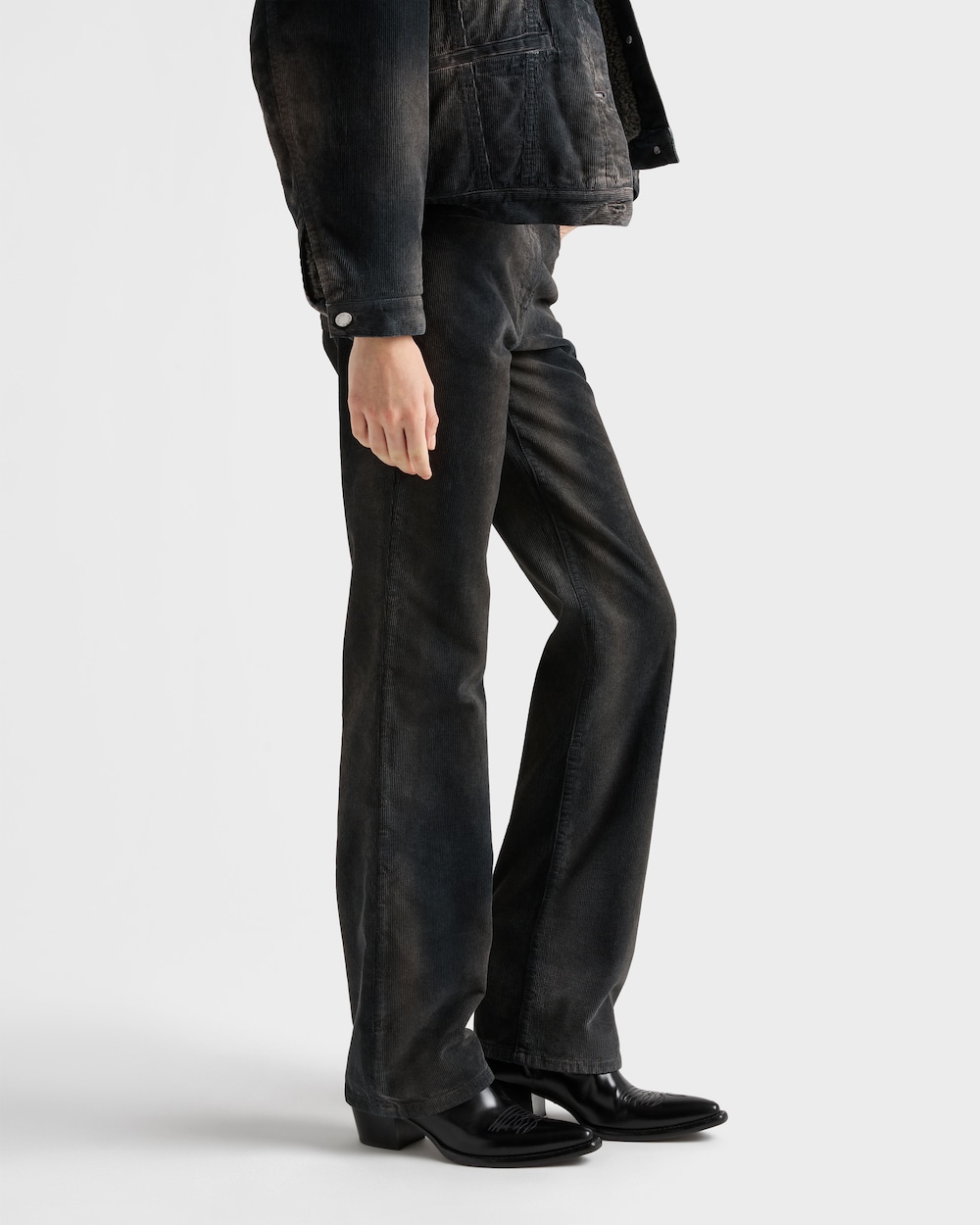Corduroy pants featuring a hybrid design and original details. Crafted with artisan techniques to replicate the texture of washed denim. The relaxed fit flared style is adorned with an archive logo printed on the label.
