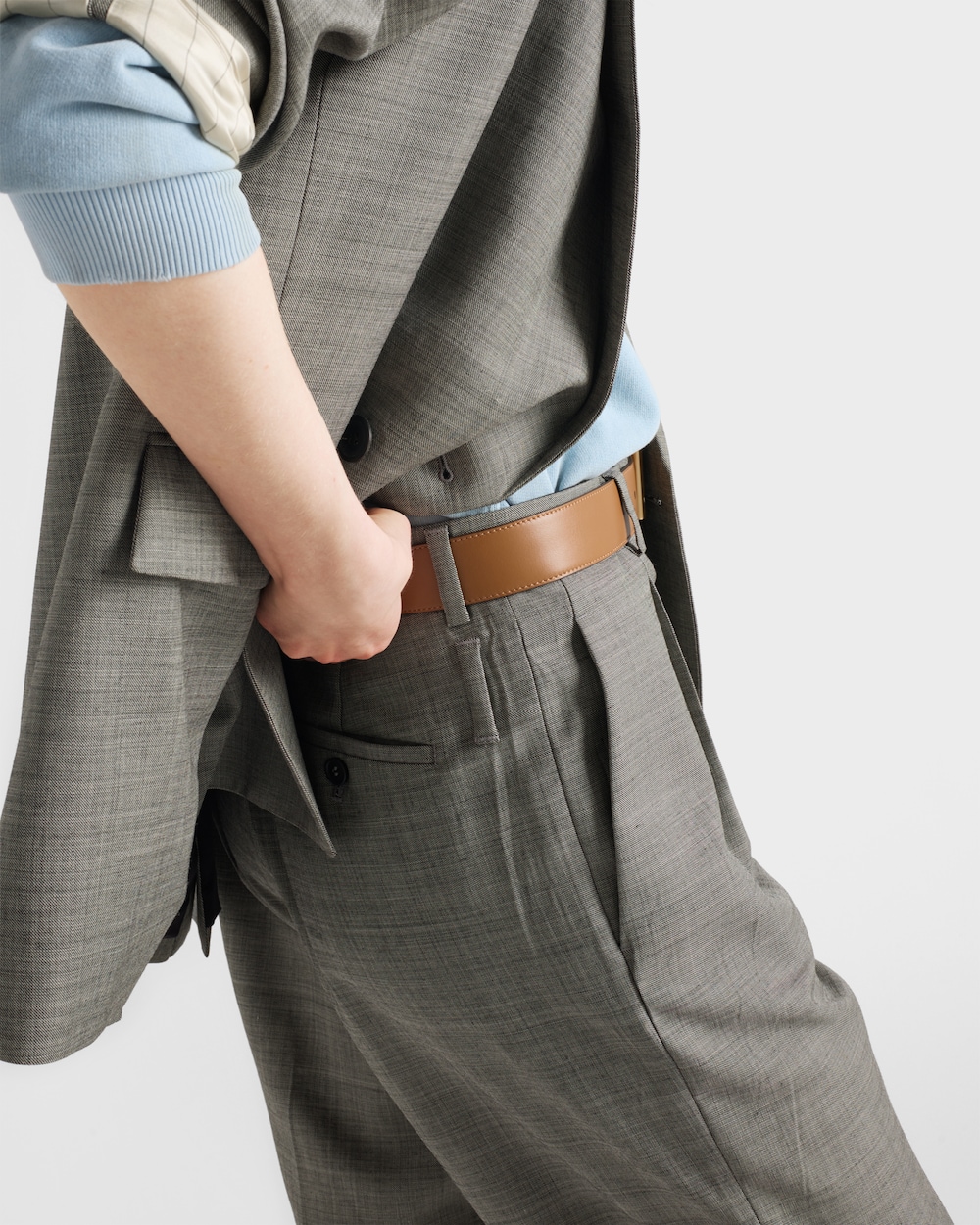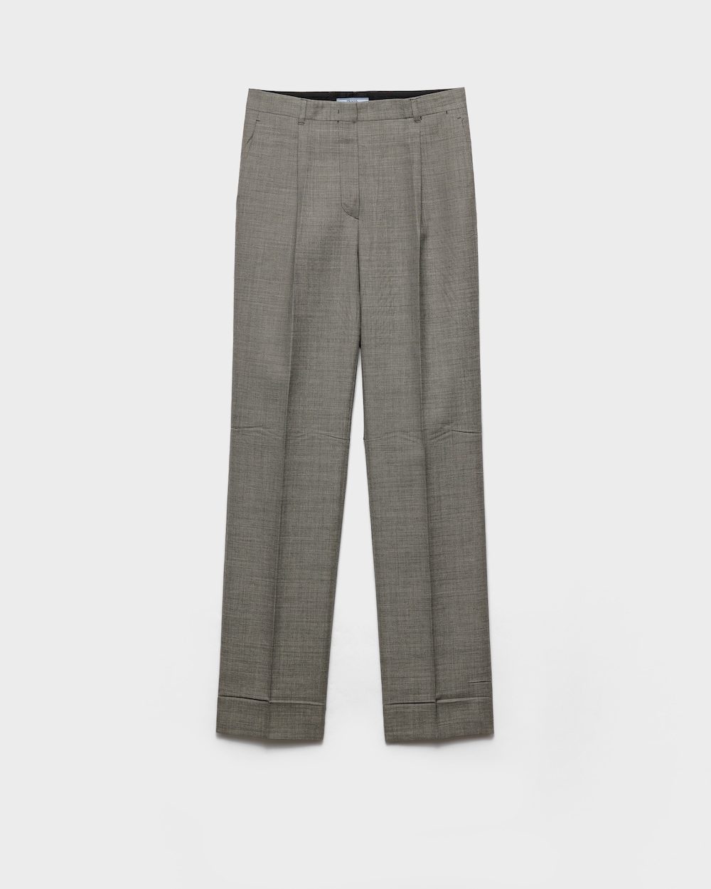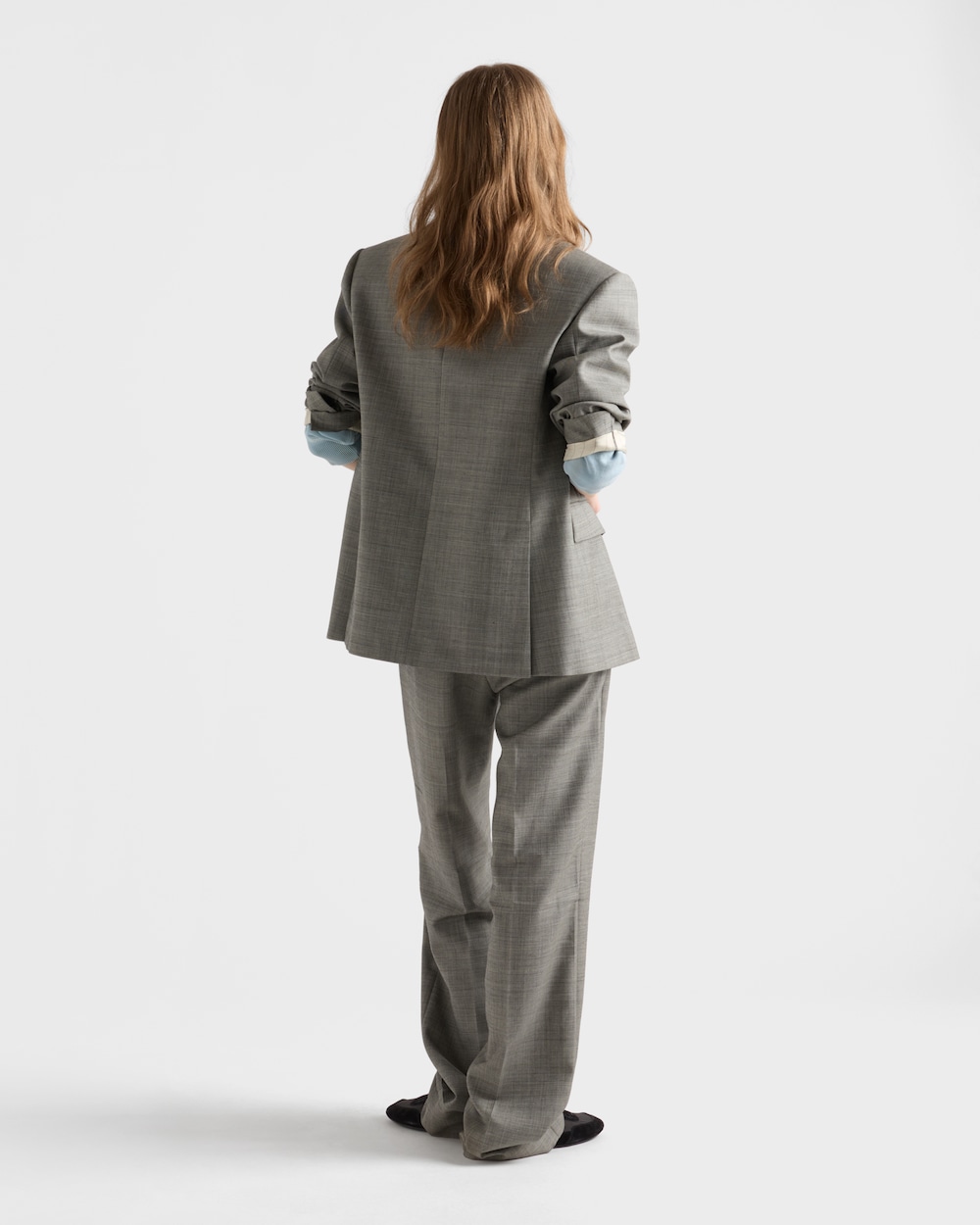 Grisaille pants reinterpreted with an oversized, low-rise cut silhouette that contrasts with the exquisite craftsmanship characteristic of classic sartorial style. This piece uses forms and materials reminiscent of menswear, arranged in a casual and modern style.