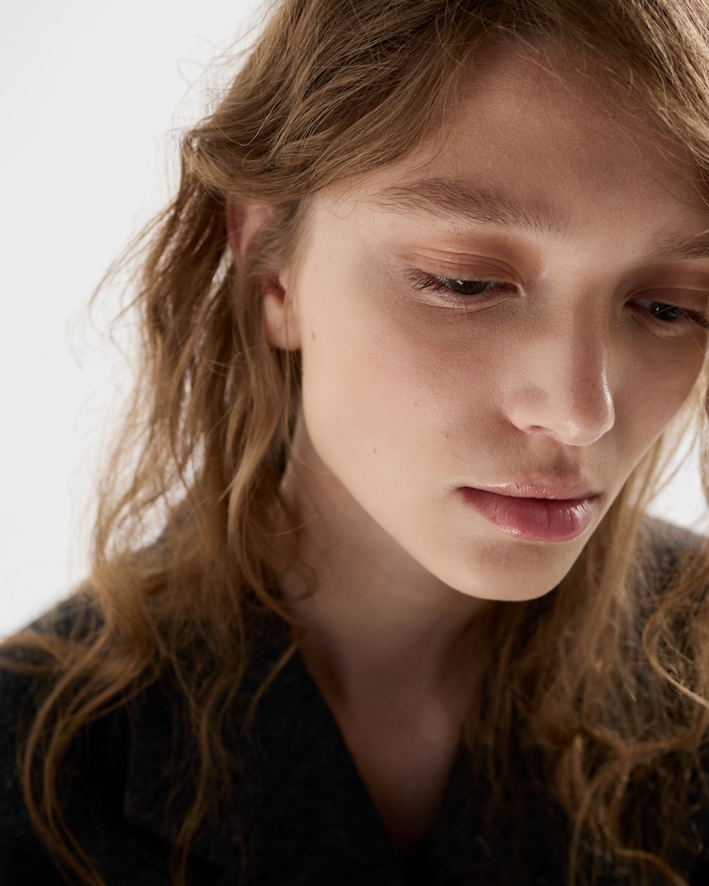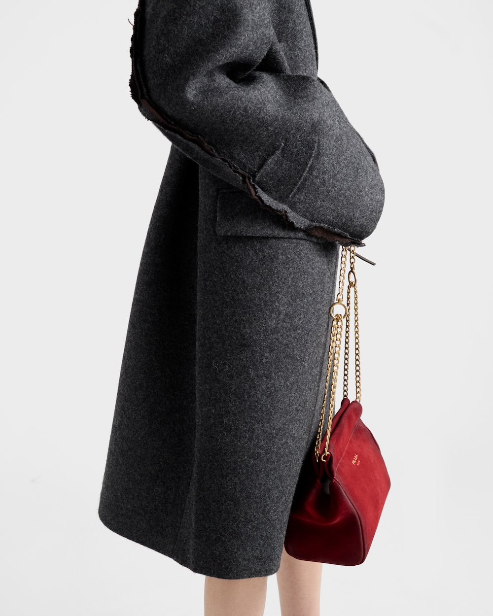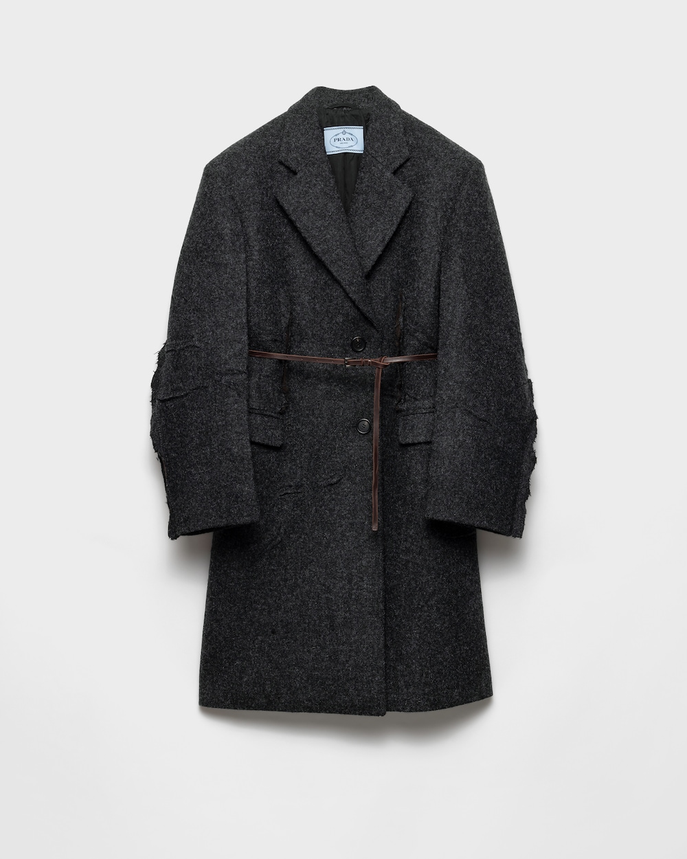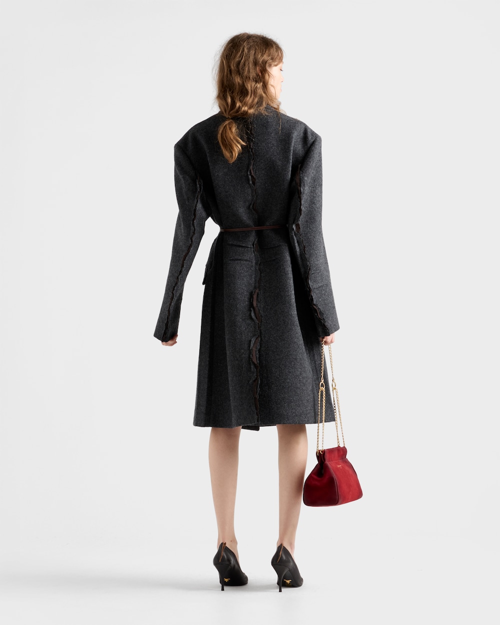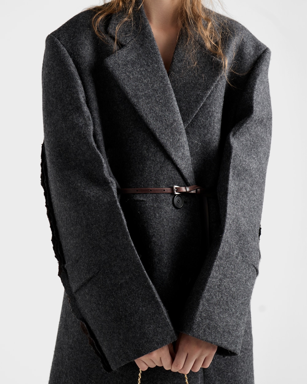 A Shetland wool coat that fuses sartorial precision with an unexpected beauty found in imperfection. The classic silhouette is reconstructed through a unique language, intentionally incorporating unfinished details. Exposed seams, pleats, and a talio à vivo finish redefine form and meaning, evoking an instinctive and unconventional elegance.