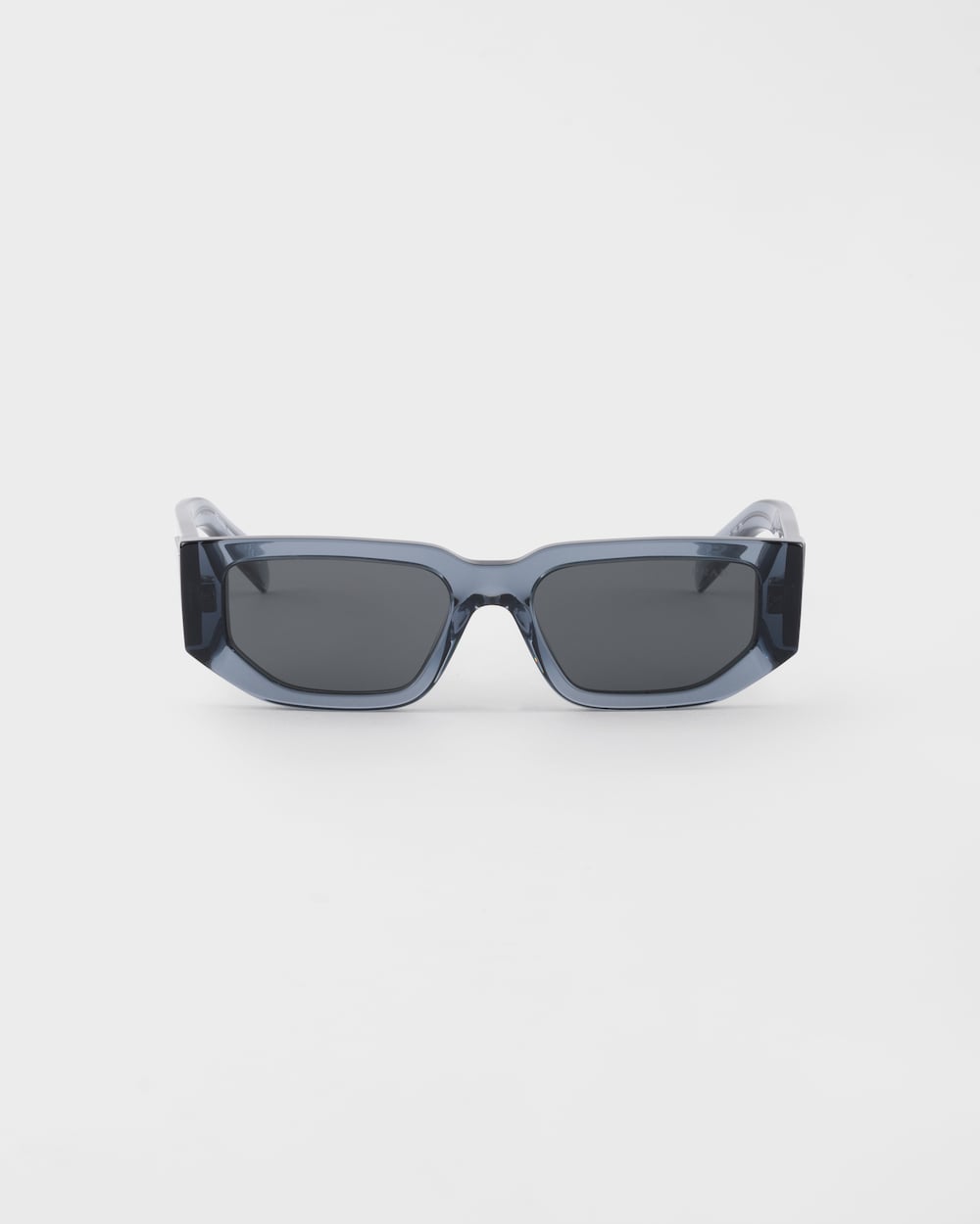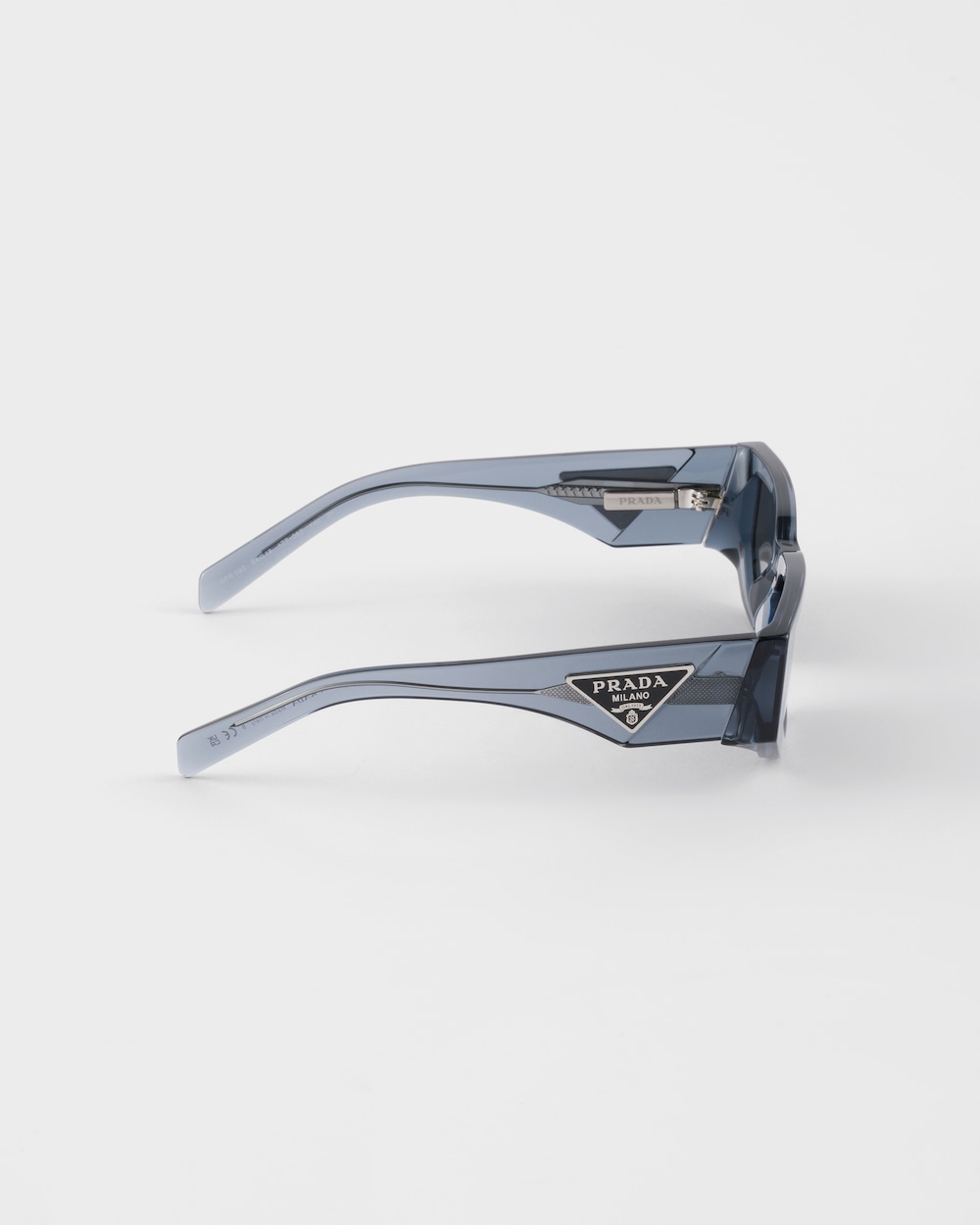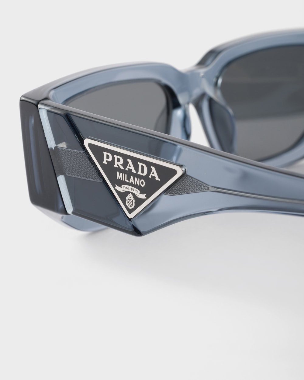 現代的なデザインのアセテート製サングラスです。角ばったリムがフレームを際立たせ、厚みのあるテンプルには、アイコニックなプラダトライアングルロゴが描かれた限定メタルプレートが装飾されています。