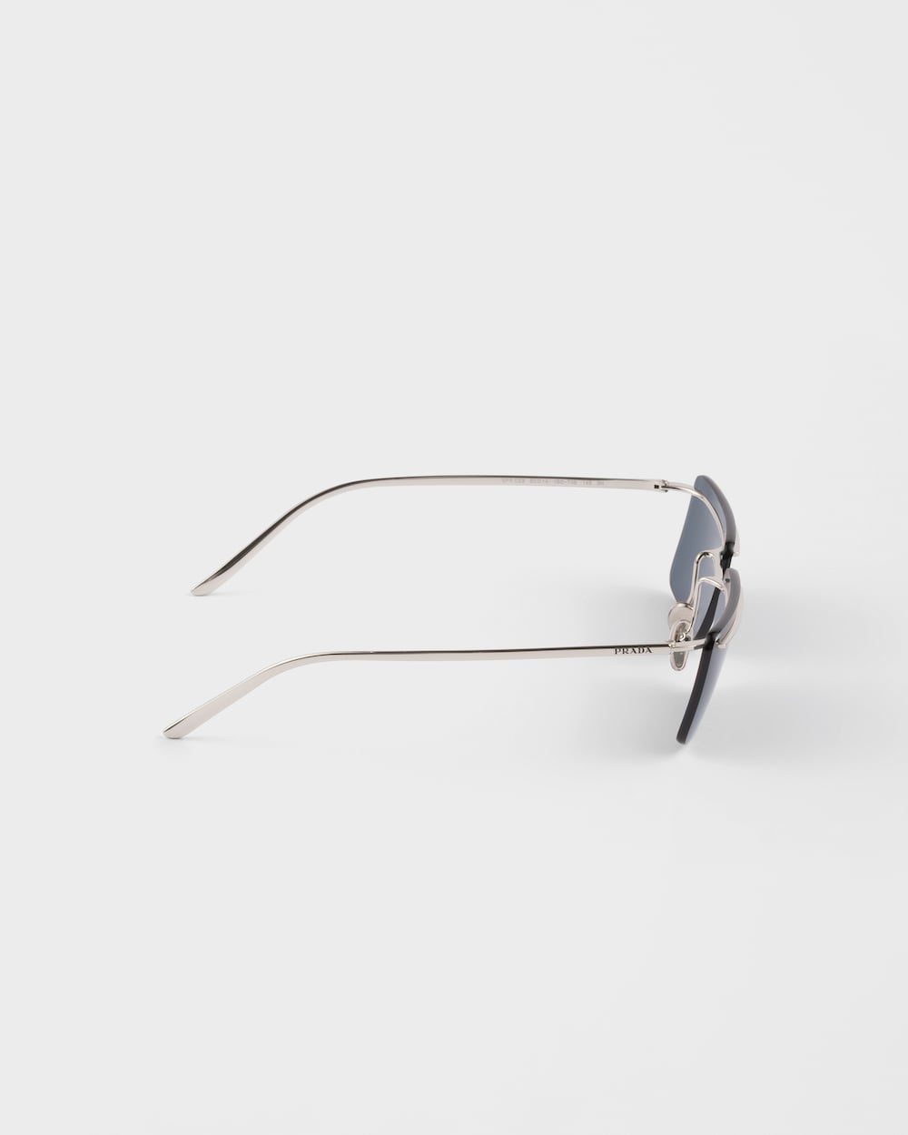 Ultra-lightweight silhouette rectangular metal sunglasses. The rimless lenses are perfectly integrated into the metal frame, creating an elegant and sophisticated beauty. The Prada lettering logo engraved on the temples completes the refined design.