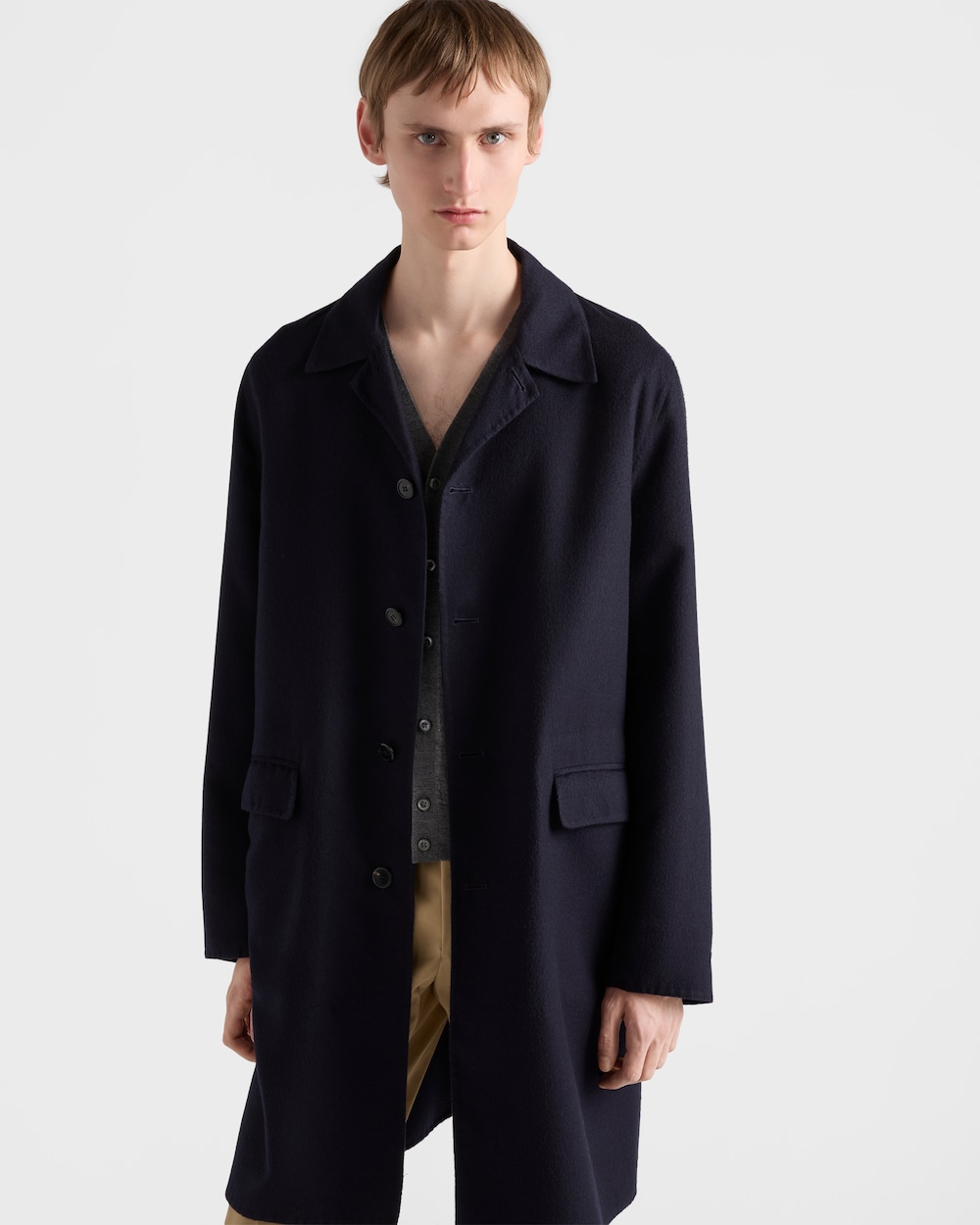 プラダのメンズコレクションを特徴づけるサルトリアルカットの精密さが、ウールとシルクのコートのようなモダンな精神を持つ衣服に見られます。スポーツの要素とクラフツマンシップを融合し、このウェアはメンズの新しいスタイルコンセプトの象徴となりました。
