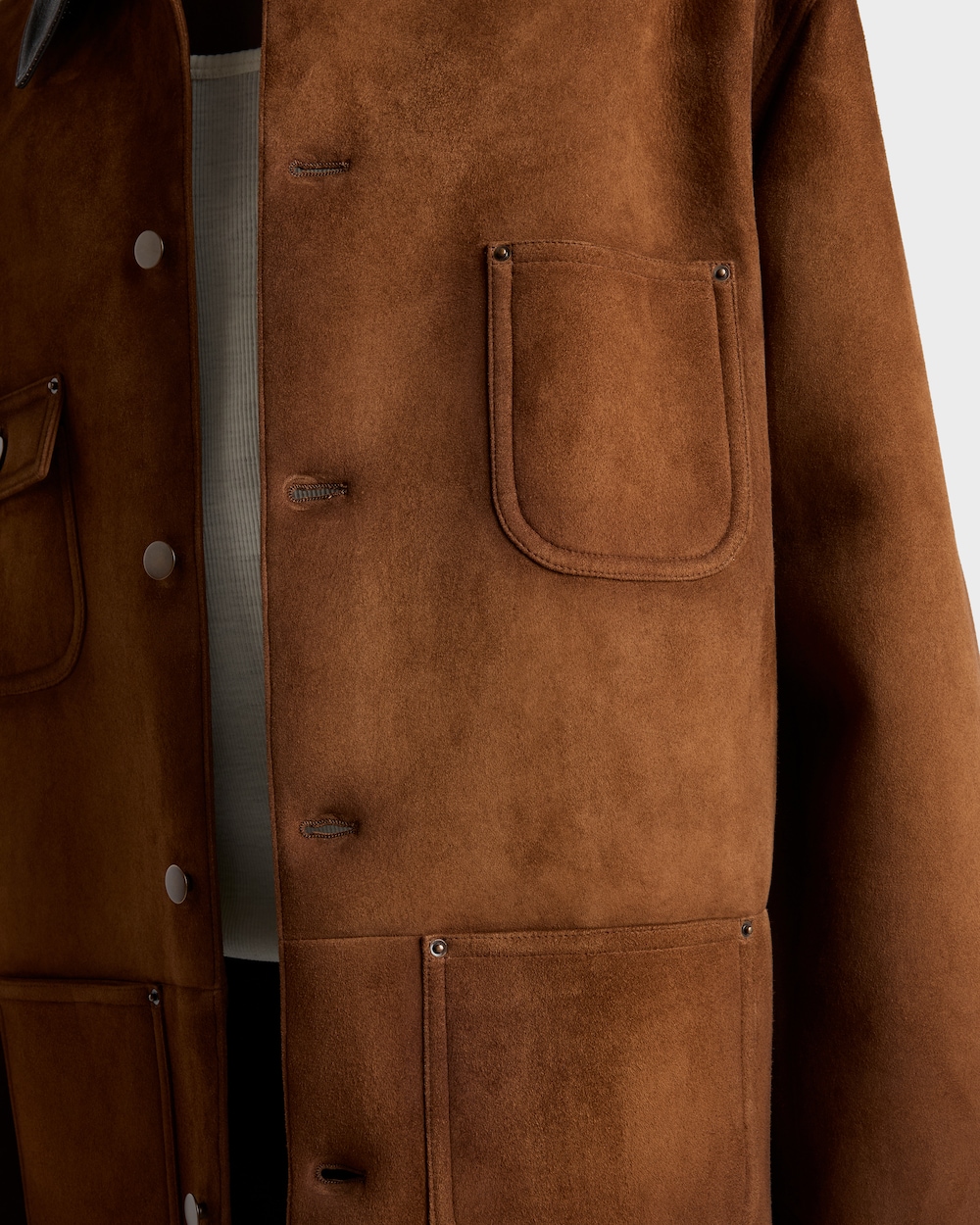 プラダのワードローブにおけるキーシルエットであるこのカバンジャケットは、ユーティリティスタイルで、柔らかなスエード素材によって再解釈されています。ベルベットのような質感は、特別な職人技による加工によって、自然な経年変化を感じさせるヴィンテージ仕上げが施されています。オーバーサイズで構築的なデザインは、コントラストの効いた色合いのレザー襟で完成されています。