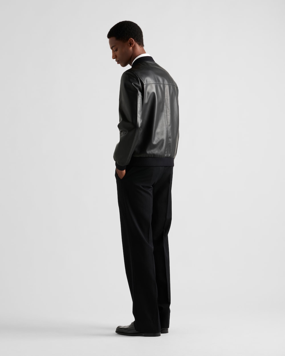 A bomber jacket made of soft and supple nappa leather (sheep leather) featuring a modern silhouette and sophisticated cut. This functional yet refined piece is designed with ribbed knit at the collar and cuffs, and has a zip closure. Adorned with an enamel metal triangle logo, it adds a Prada-like accent to a casual jacket.