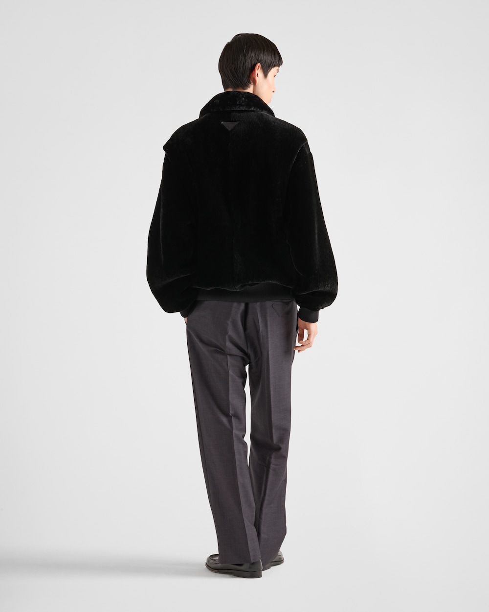 A bomber jacket with a soft oversized silhouette that is attractive. It uses shearling to add volume to the sporty design and features a triangle logo in matching leather.